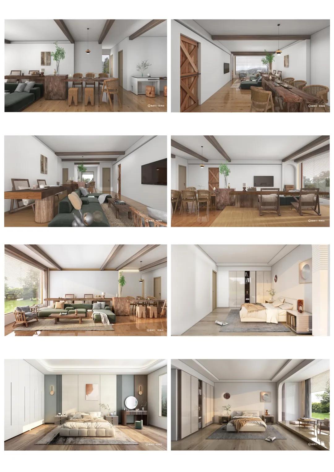 本案在设计上没有添加复杂繁琐的装饰,给空间适当留白,让生活和心境更加平和,为居住者打造一处安宁的归宿。木制品和木色呈现居多,简约又不失优雅,利用设计结合环境,烘托出宁静、温馨和自然的氛围。室内选用无主灯设计,客餐厅一体化,实现“一通到底”的开阔感,使空间更为通透。空间在整体布局上简约,又满足着最基本的功能需求。当户外光线透过玻璃照进室内,光与影在空间交织,尽显一个有温度的居住空间。