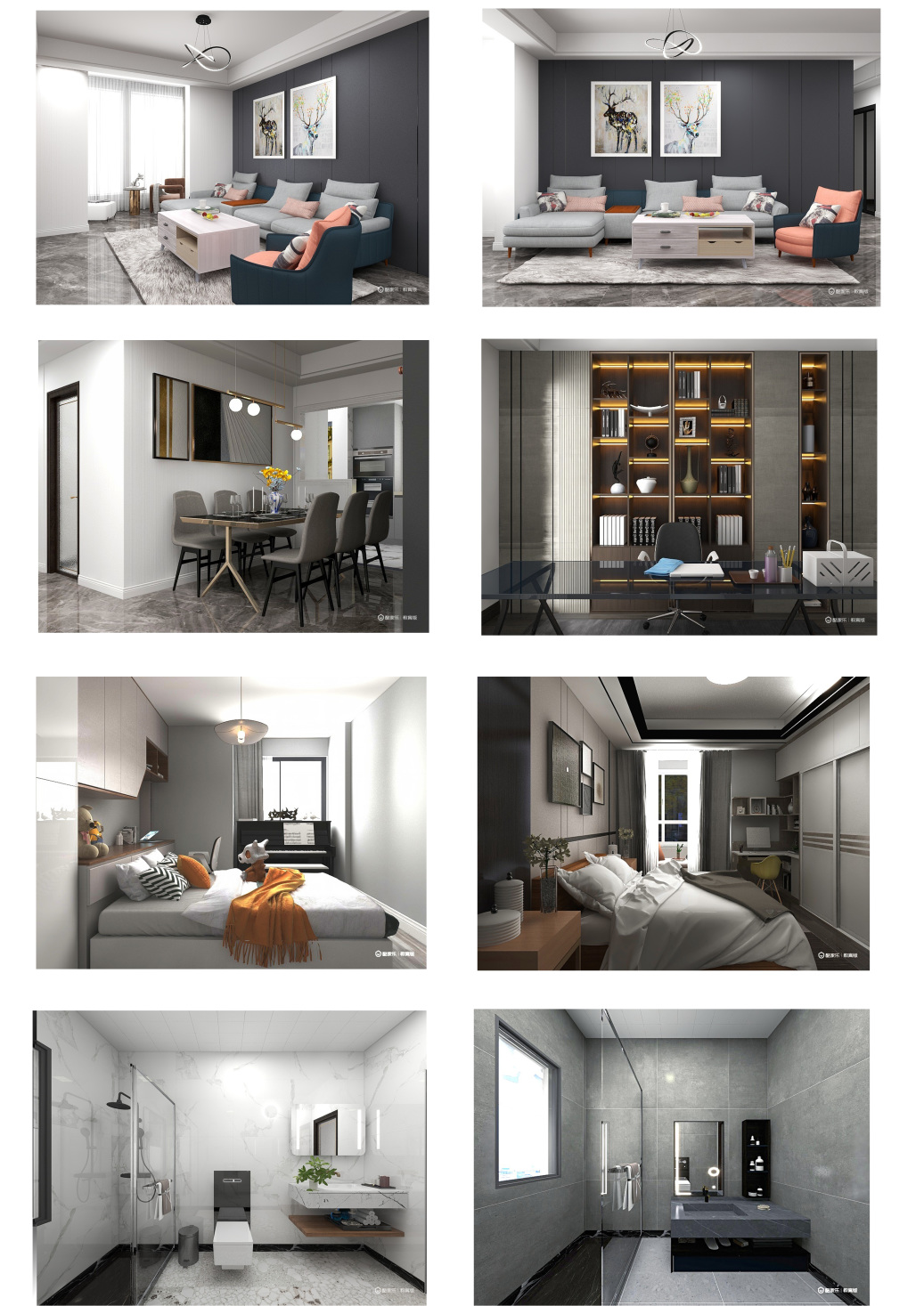 本方案为四室两厅两卫的居室设计,业主为一对年轻夫妇,妻子是中学教师,丈夫是律师,家中有两位老人以及一位十四岁正在上寄宿制学校的儿子。针对一家五口不同年龄层次的设计需要,整体设计以简约大气为主,颜色以白色以及深灰色为主,在软装上面用少量彩色点缀画面。没有夸张、不显浮华,通过干干净净的设计手法,切实考虑一家五口各自的需求,做到适合家中每一个人的宜居设计。