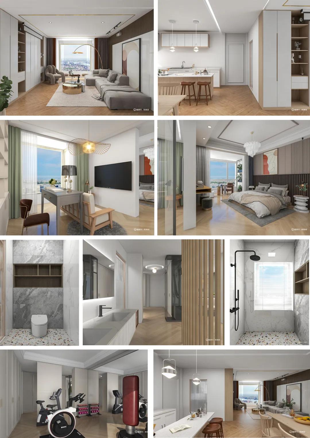 本次套房内共设两厅两卫两卧,为使室内更加丰富,还设置有健身器材、榻榻米阳台等休闲设施,并选取了色彩更加明艳丰富的家具,使屋内整体氛围更加温馨活泼。除此以外,在设计过程中,我利用隔断将空间进行划分,既做到了视线与区域的有效分隔,也十分美观大方,具有观赏性的同时也十分实用。
