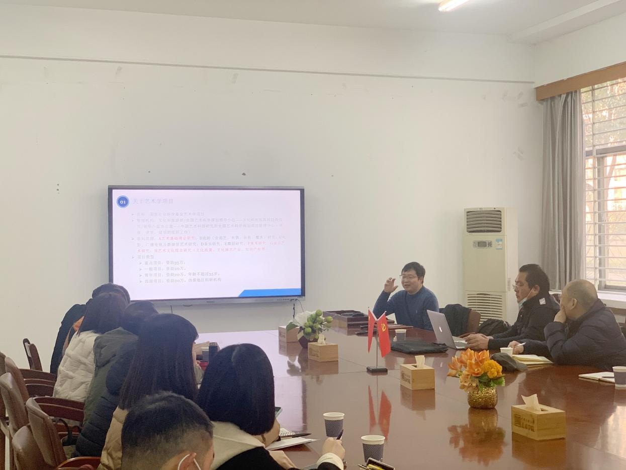 为了进一步推进我院2022年度国家社会科学基金项目申报工作,提高申报质量,美术学院于2022年1月2日在学院会议室举行2022年国家社科基金项目指导交流会。会议邀请了王学文教授作为专家进行了经验分享和交流指导,王文学博士、教授、研究员,现任中国科技产业化促进会文化寻力工作委员会执行主任,兼任清华大学中美关系研究中心、山东大学文化遗产研究院等高校客座研究员。美术学院各教研室主任,以及预申报2022年国家社科基金项目的教师参加了会议,会议由学院院长吴海广主持。