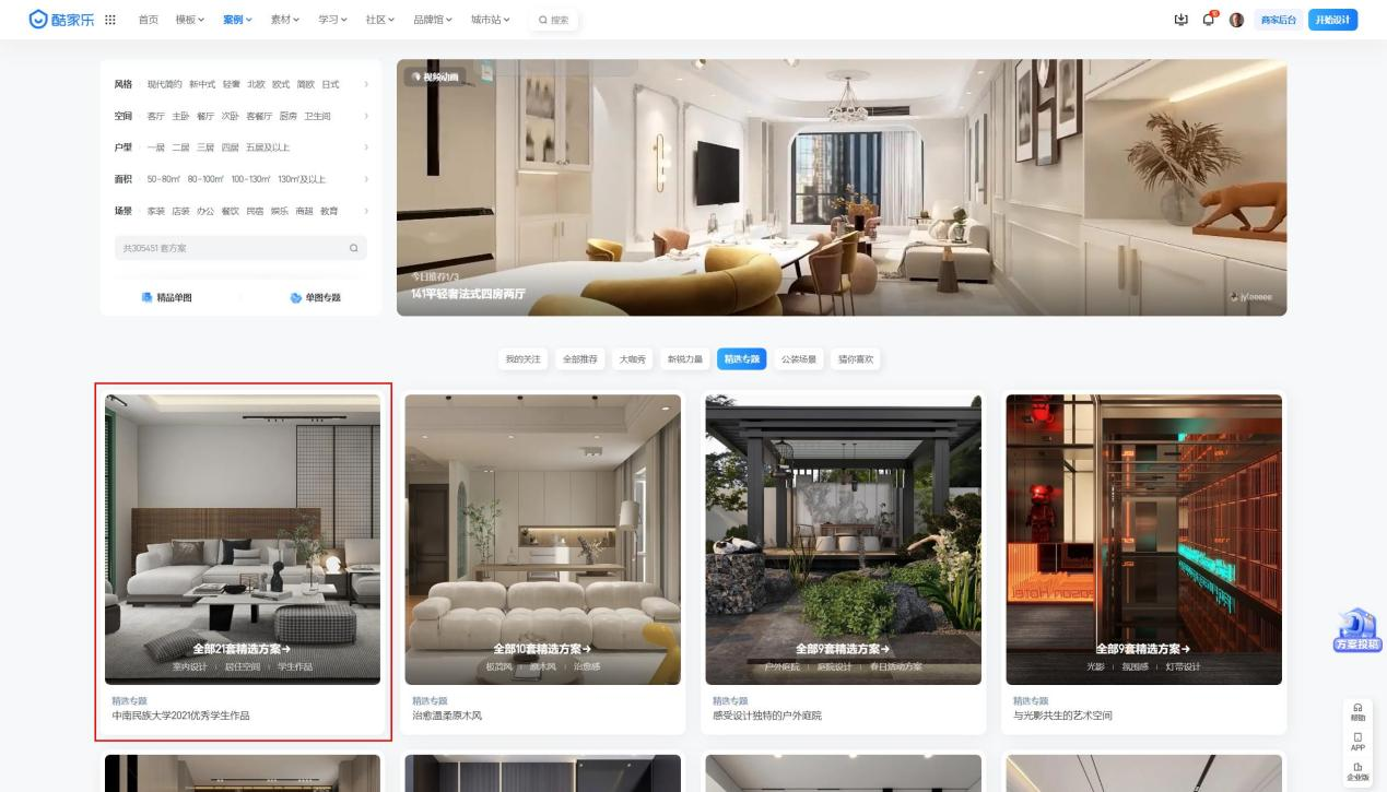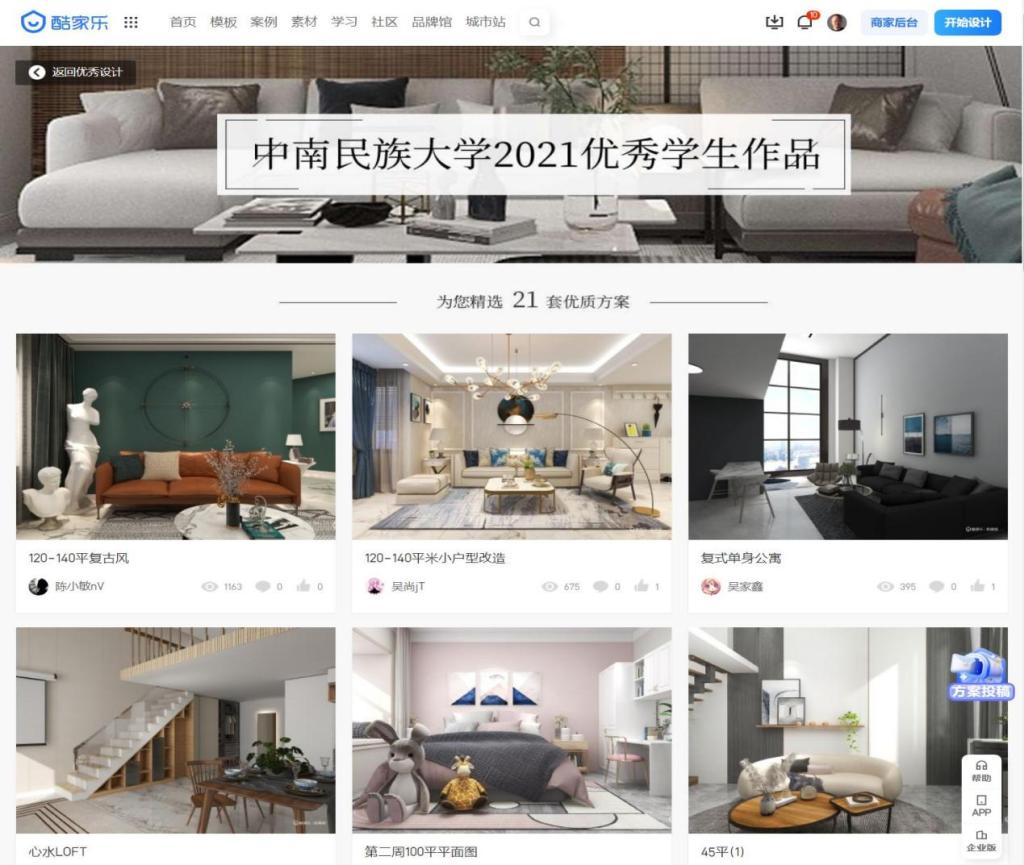 2022年4月11日,以分布式并行计算和多媒体数据挖掘为技术核心的全球云设计软件创新者、VR智能室内设计平台——酷家乐,“精选专题”展区专栏推出了“beat365英国正版唯一网址2021优秀学生作品”专区。我院环境设计专业2019级室内设计方向班《居住空间设计》课程21套优秀学生作品被收录其中,并面向酷家乐平台所有用户开放推介。