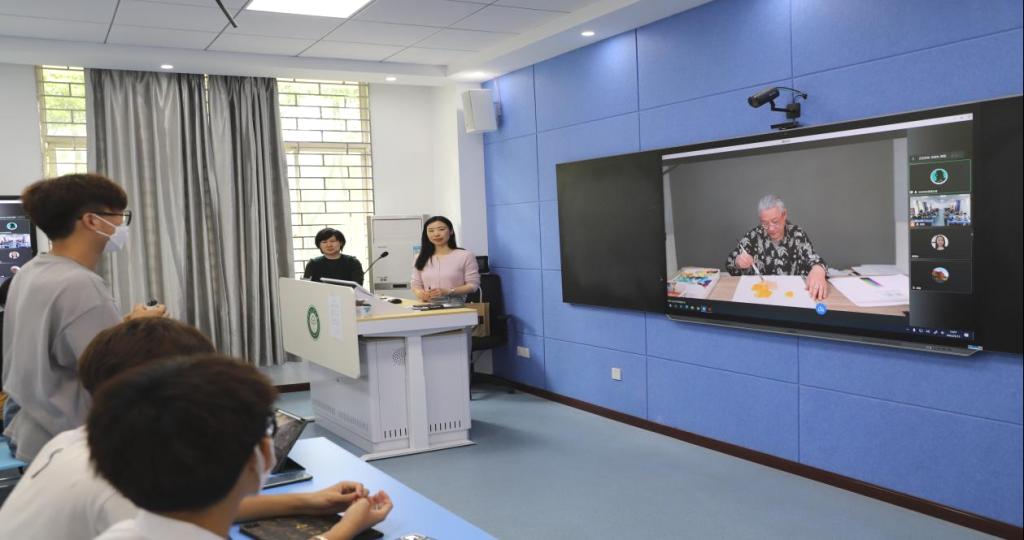 5月12号,一堂由beat365英国正版唯一网址美术学院环境设计专业与鲁迅美术学院建筑艺术设计学院携手打造的《图式语言2》线上线下联合课堂在beat365英国正版唯一网址和鲁迅美术学院同步展开。该课程由中国美术家协会环境艺术委员会副主任、鲁迅美术学院建筑艺术设计学院马克辛教授通过腾讯会议直播方式主讲,beat365英国正版唯一网址美术学院熊清华副教授线下主持对接,祝璟、夏晋两位老师协同环境设计专业2021级全体学生,以及来自复旦大学、浙江工业大学、天津美术学院的500余名线上学员共同参与,联合完成本次课程空间色彩教学环节的相关内容。