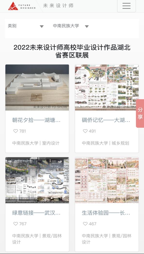 为展示高校艺术设计教学成果,加强艺术设计专业之间的交流,展现院校风采,提升院校、专业影响力,更好地组织各赛区未来设计师大赛工作。中国高等教育学会《全国普通高校学科竞赛排行榜》榜单赛事,未来设计师·全国高校数字艺术设计大赛(NCDA)大赛组委会联合各省级分赛区承办学校,举办“2022未来设计师·高校毕业设计作品省级云展”于2022年6月1日开展。我院环境设计专业10组优秀毕业设计作品首次入选“2022未来设计师·高校毕业设计作品湖北省赛区云展”。