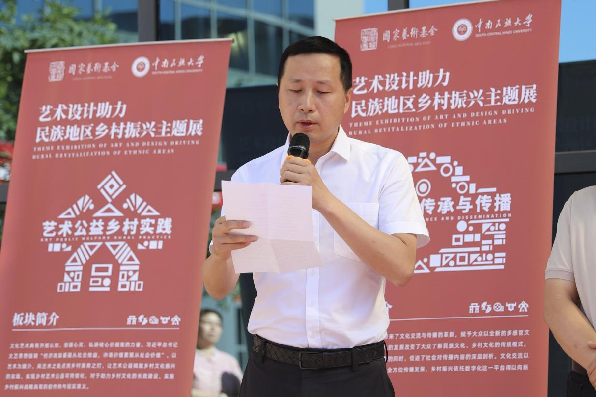 开幕式上,项目负责人程超教授首先致辞,他介绍道:“在国家乡村振兴战略背景下,艺术与设计也可以作为一种生产力,在乡村建设中发挥着越来越大的作用。近年来,政府、高校、企业和个人等多方大力参与乡村振兴的艺术设计实践,产生了众多优秀设计成果。”在介绍展览项目的同时,程超教授对北方民族大学的大力支持表达了感谢。