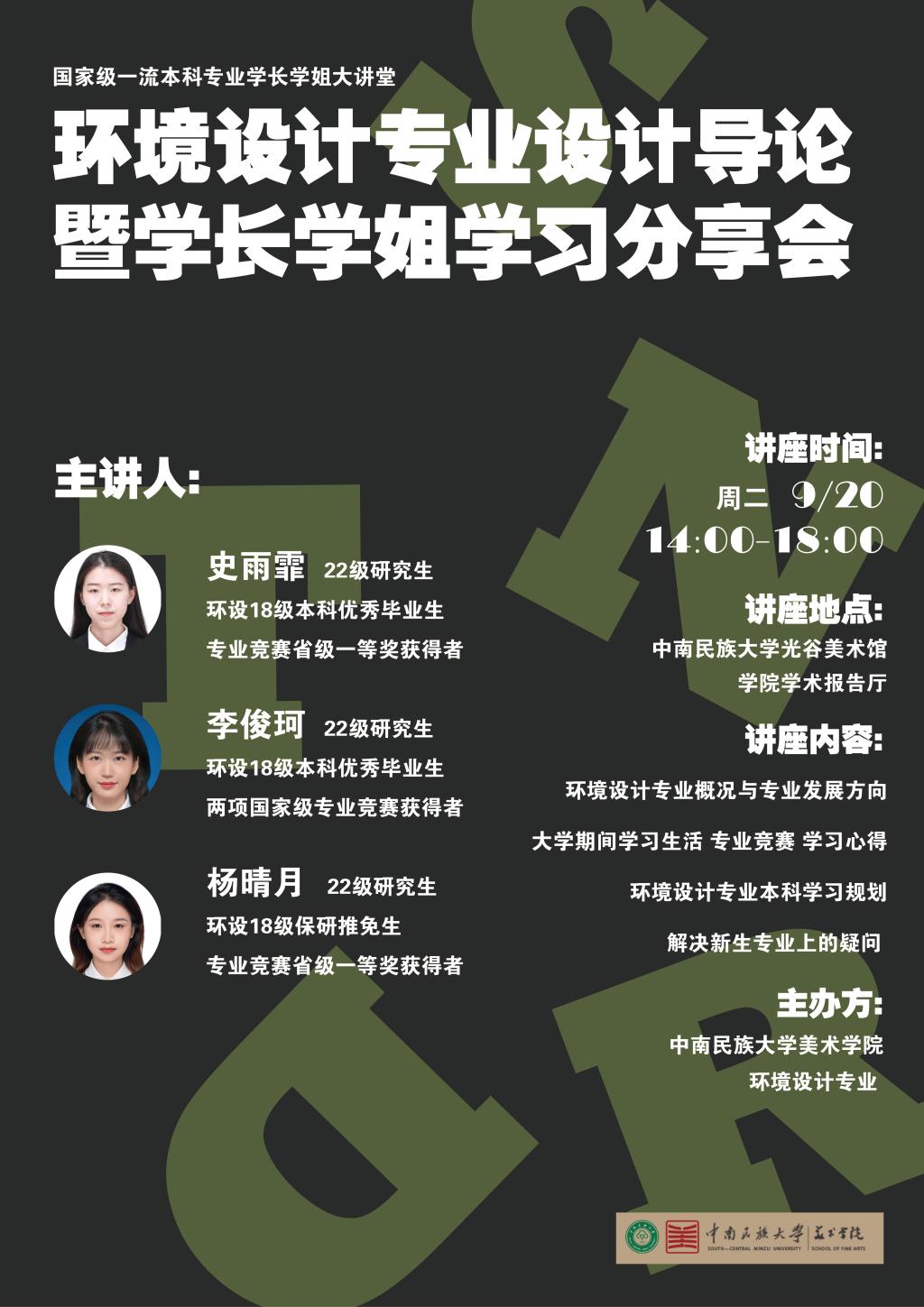 2022年9月20日下午,一场由beat365英国正版唯一网址国家一流本科专业建设点组织的“环境设计专业设计导论暨学长学姐分享会”在光谷美术馆三楼学术报告厅如火如荼地展开。本次分享会由环境设计专业负责人夏晋老师主持,并特别邀请了本专业应届毕业,且继续在校攻读硕士研究生的李俊珂、史雨霏、杨晴月等3位优秀学姐,以她们自身的求学经历为蓝图,学业的亲身感悟为蓝本,为在场的60位2022级环境专业萌新们分享了一场关于“民大环设的学习生活故事”。