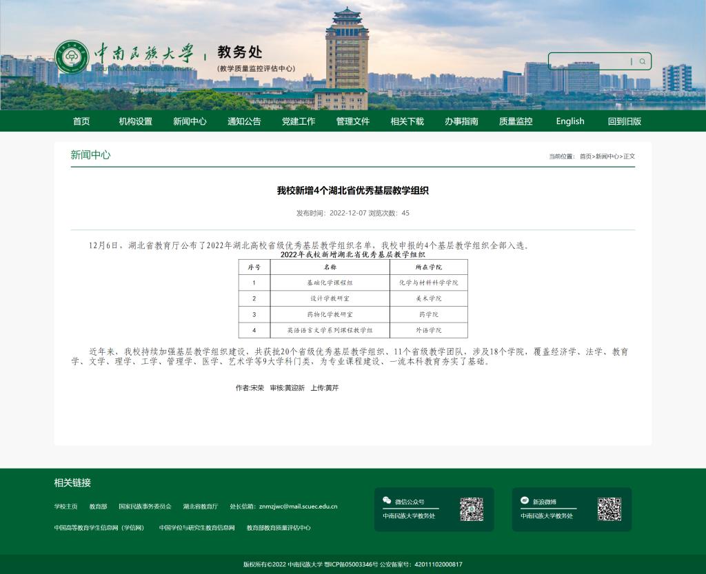 12月6日,湖北省教育厅公布了151个省级优秀基层教学组织名单,beat365官网4个基层教学组织入选。美术学院环境设计国家一流专业建设点负责人,设计学学科点负责人夏晋教授牵头申报的“设计学教研室”入选2022年湖北高校省级优秀基层教学组织。