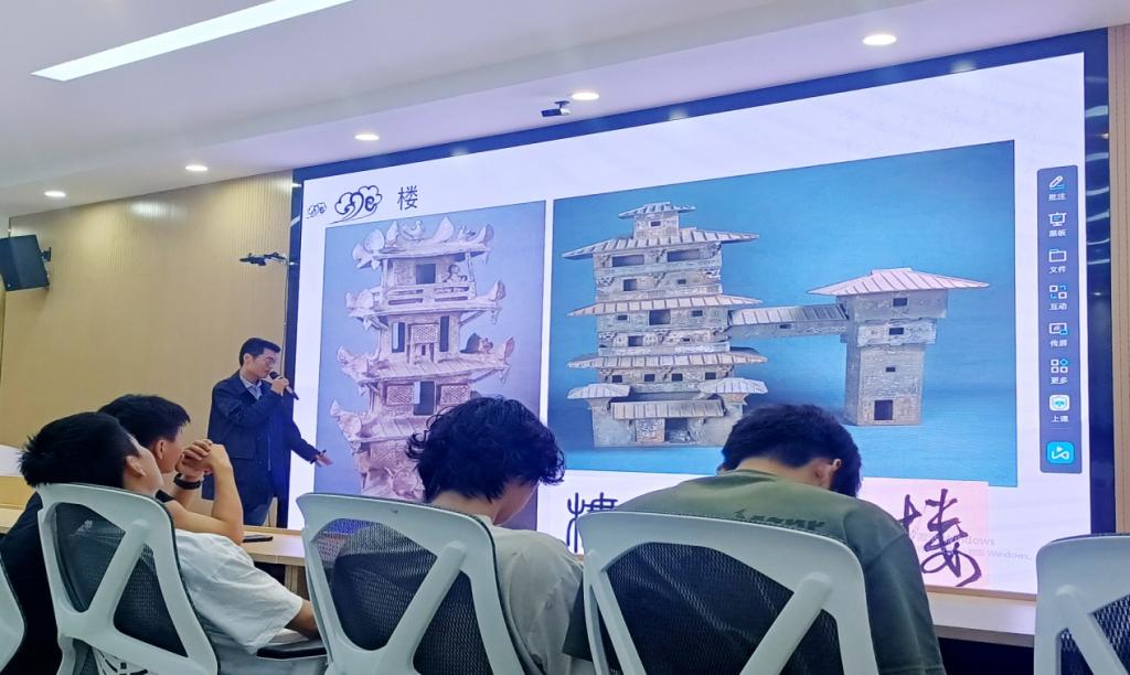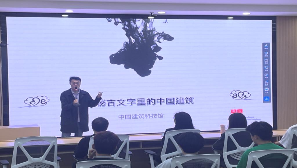 本期“匠心课堂”联合课程教学活动,由beat365英国正版唯一网址美术学院环境设计专业孙云娟老师主持,中国建筑科技馆资深志愿者,东湖高新区“最美志愿者”伍轶豪老师主讲。伍老师首先对秘古文字里的中国建筑中的“建”和“筑”二字在古文字中由来进行了简要解释,并从单体建筑、群体建筑两个部分进行讲授。