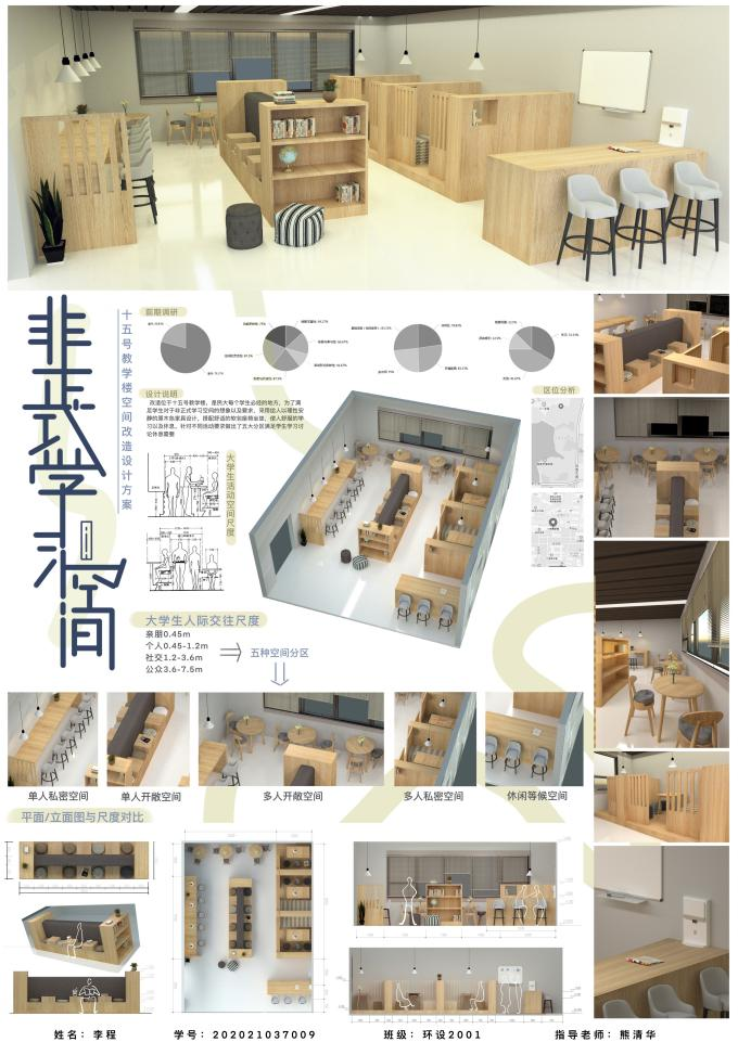 此次课程在理论知识学习基础上,根据发现大学生自身学习生活的校园缺少课外学习空间的实际问题,要求学生在校园内以“非正式学习空间”为设计内容,“寻找”适合课外学习的“可再利用”室内外空间,并以5-6人小组形式展开实地调研、场地测量与分析、最后确定设计区位和主题。要求学生根据自己的选址进行方案构思、小组讨论和两次初步方案汇报,最后教师点评、学生互评、方案修改,最终课程考核作业以展板的形式呈现。