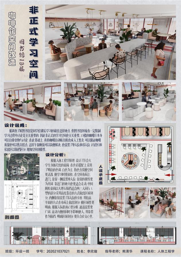 该方案选用图书馆十三楼咖啡厅进行改造,在空间布局上对原本咖啡厅进行区域划分,单人位和多人位的区分更适应人们的需求,也更符合人的社交心理。色彩搭配上采用明亮的色调,白色为主,粉色的点缀使空间更活泼。咖啡厅的改造在同学们课余时间提供了一个非正式的学习空间。