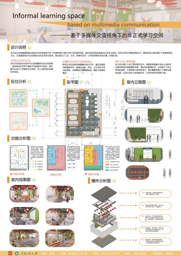 此次设计的选题围绕湖北省武汉市beat365英国正版唯一网址 15栋教学楼-4楼公共学习空间的改造。我们旨在将其改造成非正式学习空间,供民大学生们课前课后学习。整体的设计我们基于了多媒体影视文化,打造成影视文化交流复合式非正式学习空间。我们结合了人文,文化,影像与艺术,公共空间等多元性元素,基于此设计了多媒体交互空间,注入全新的交往模式与体验,宏观打造。