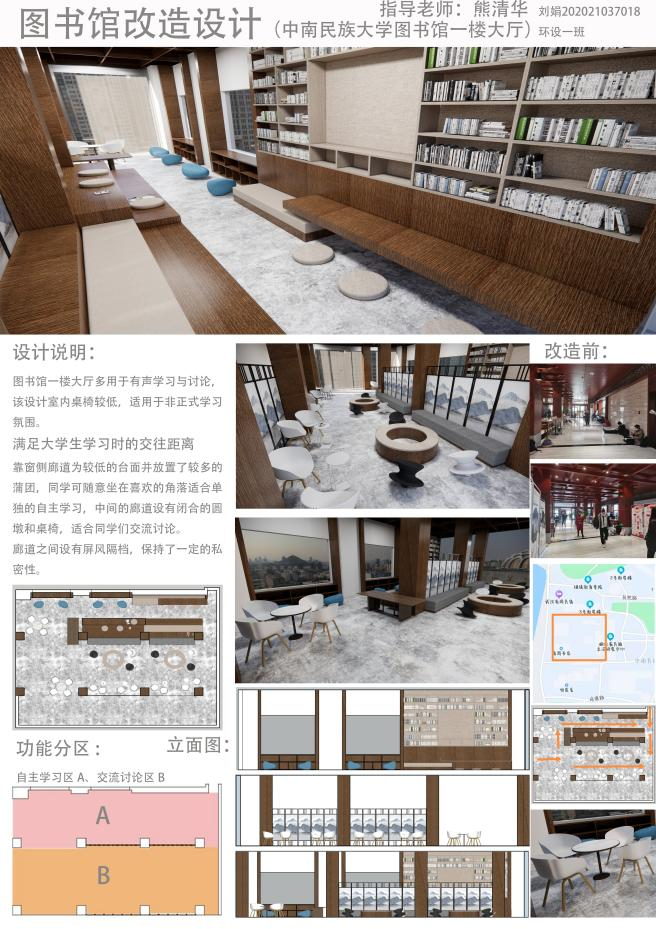 本设计选址在beat365官网15号楼四楼的部分空间,在本次设计前期我们对本校师生进行了调查问卷,采用木质材料营造舒适、轻松的学习环境,满足当代大学生的需求。