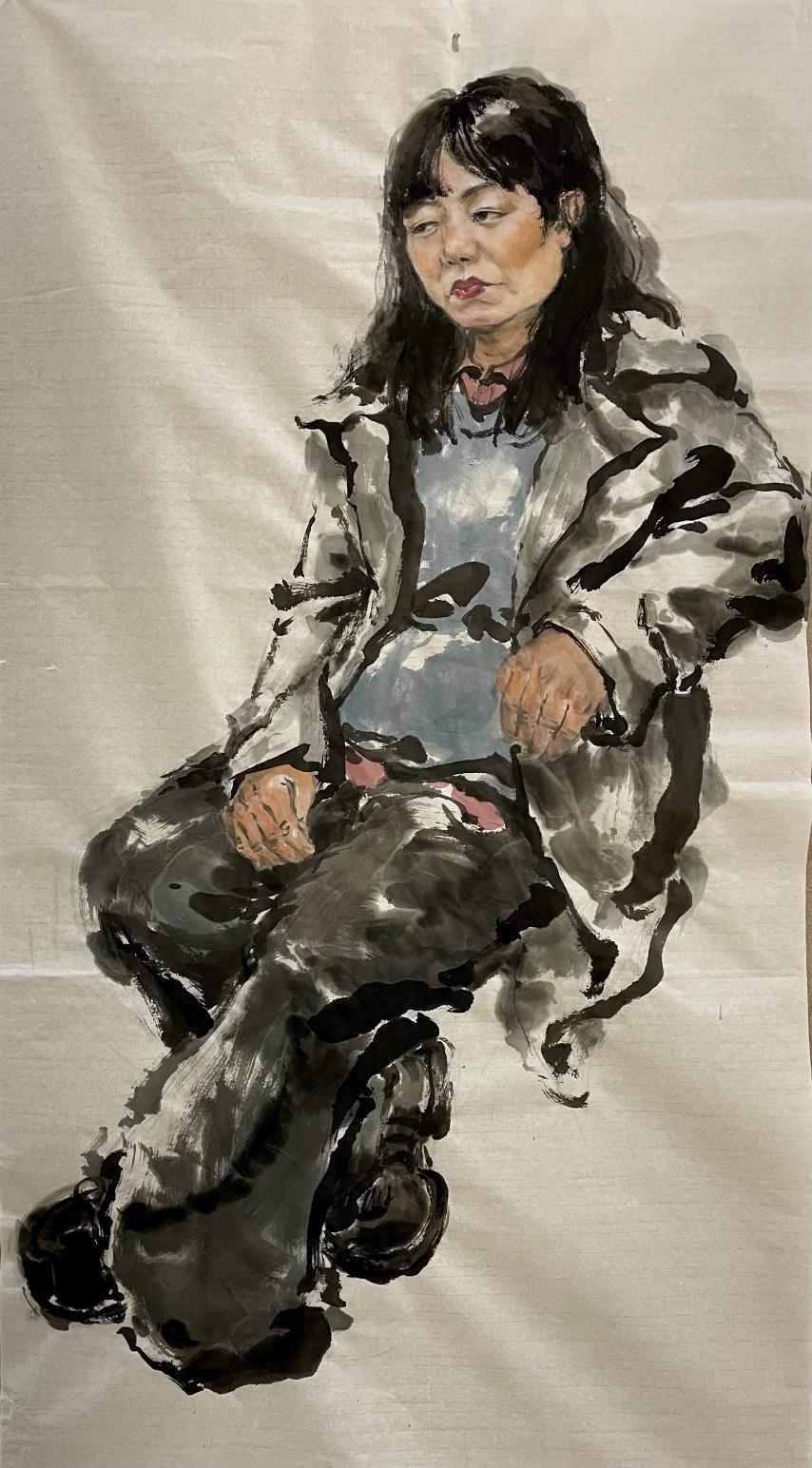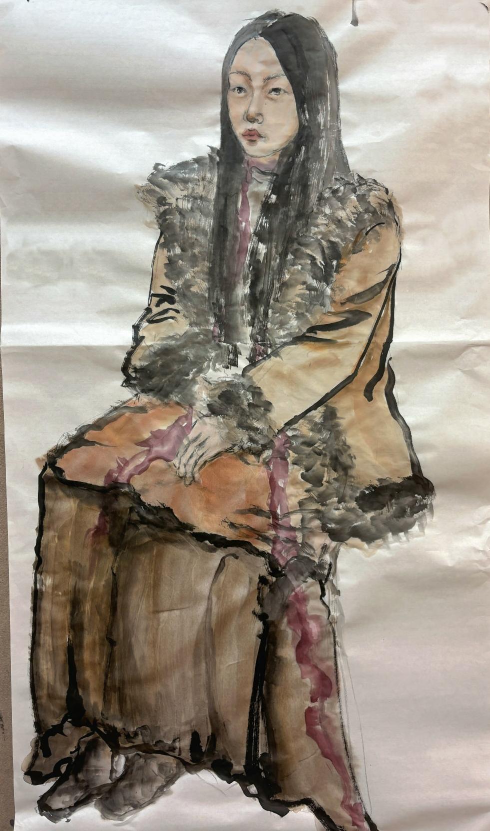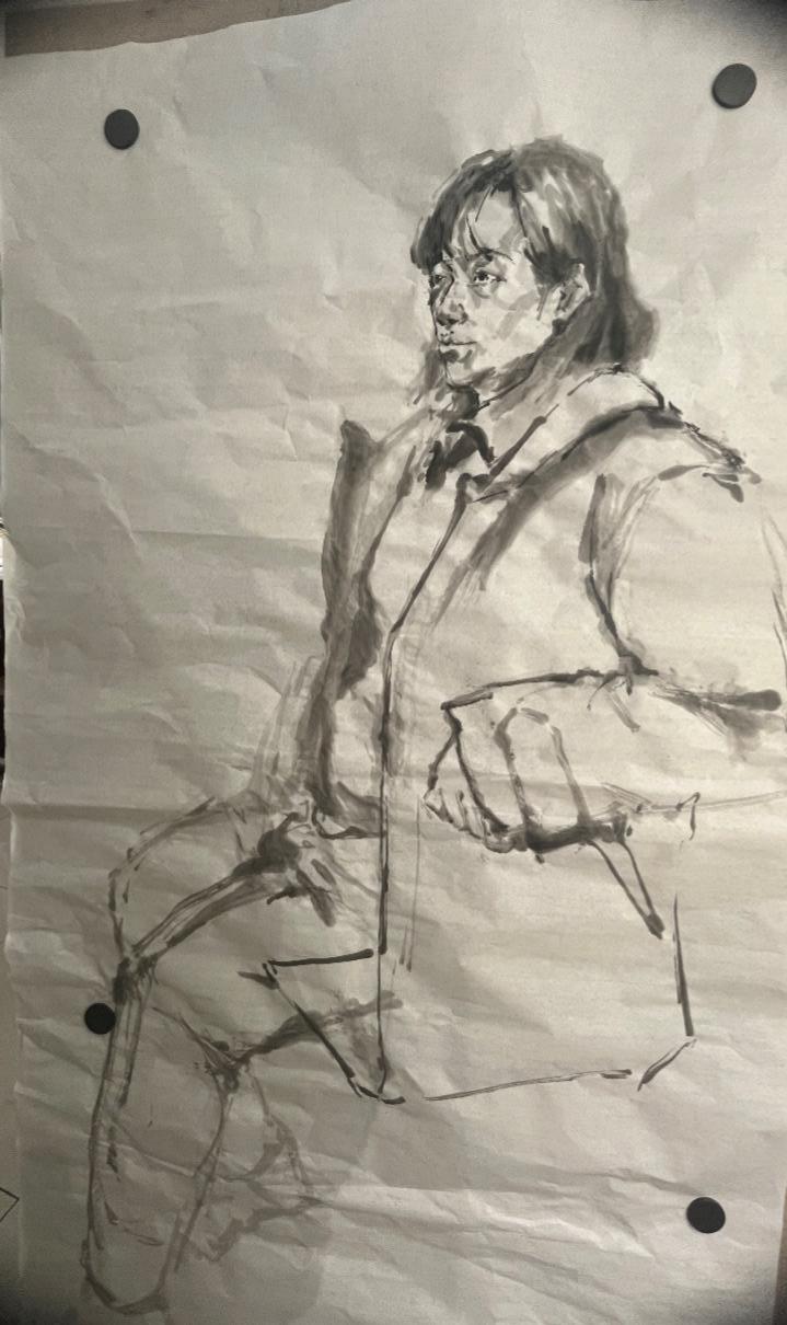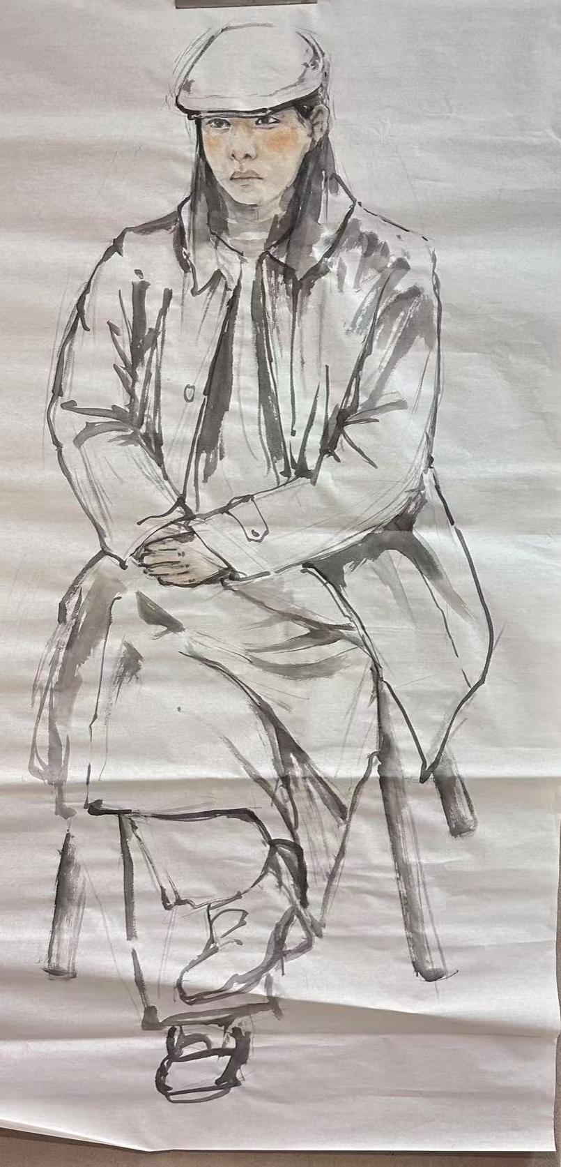 上了毛笔人物写生这门课,让我们受益颇多。毛笔人物画写生注重笔墨的运用,通过线条的粗细、浓淡、虚实来表现人物的形态和神韵。陈岱老师的教学让我们深刻体会到这一艺术形式独特的魅力与价值,我们在实践中我们学会了如何观察人物的特征,并尝试将其转化为笔墨语言,学会如何运用笔墨色彩的浓淡、干湿来表现人物的神态和气质,学会了运用不同的笔触和墨色来表现人物的不同质感和情绪。从浓淡干湿,到快慢转折,每一次落笔都需要精心斟酌,以求与对象相呼应。这种技巧的训练,让我们在表达人物肖像时能更加自如地使用工具去驾驭画面,让作品流露出丰富的层次和变化,这对提升我们的绘画技巧有很大帮助。