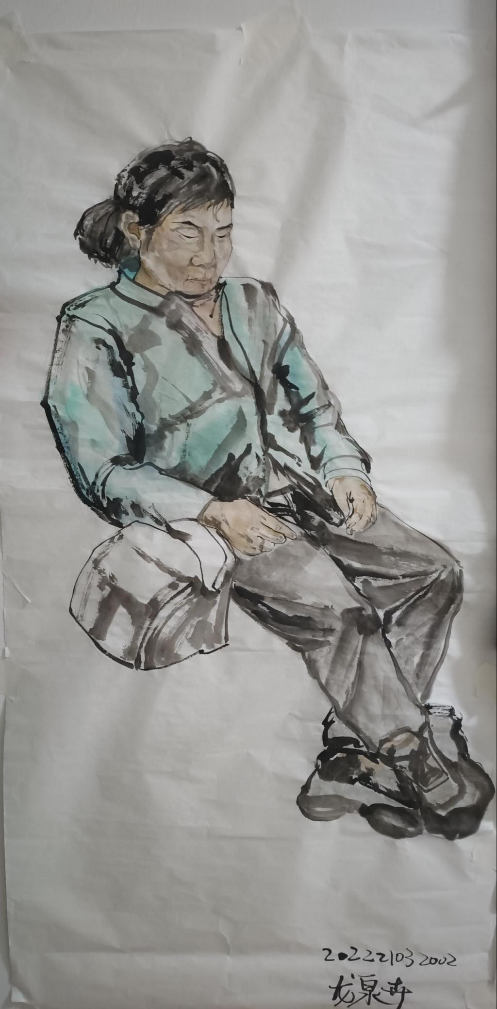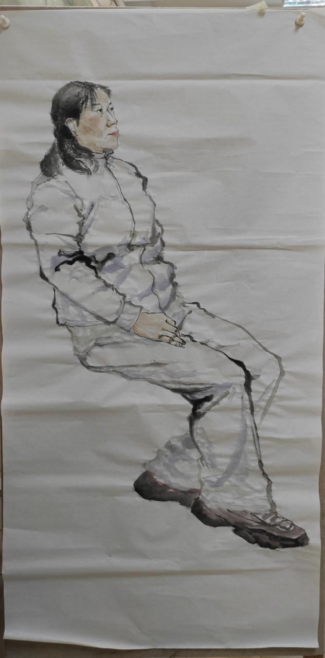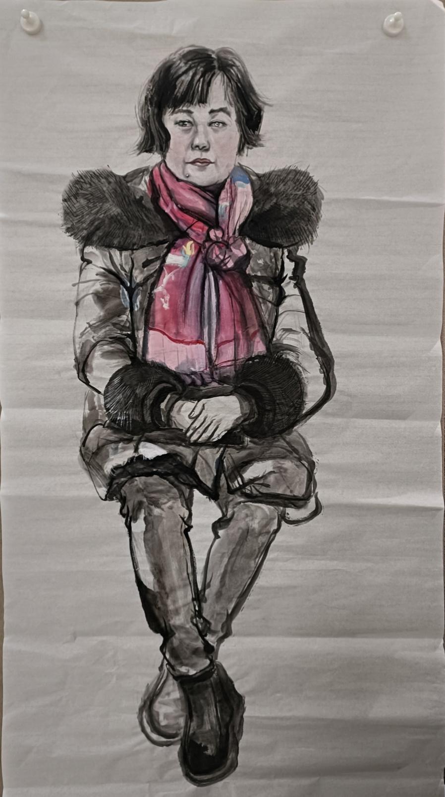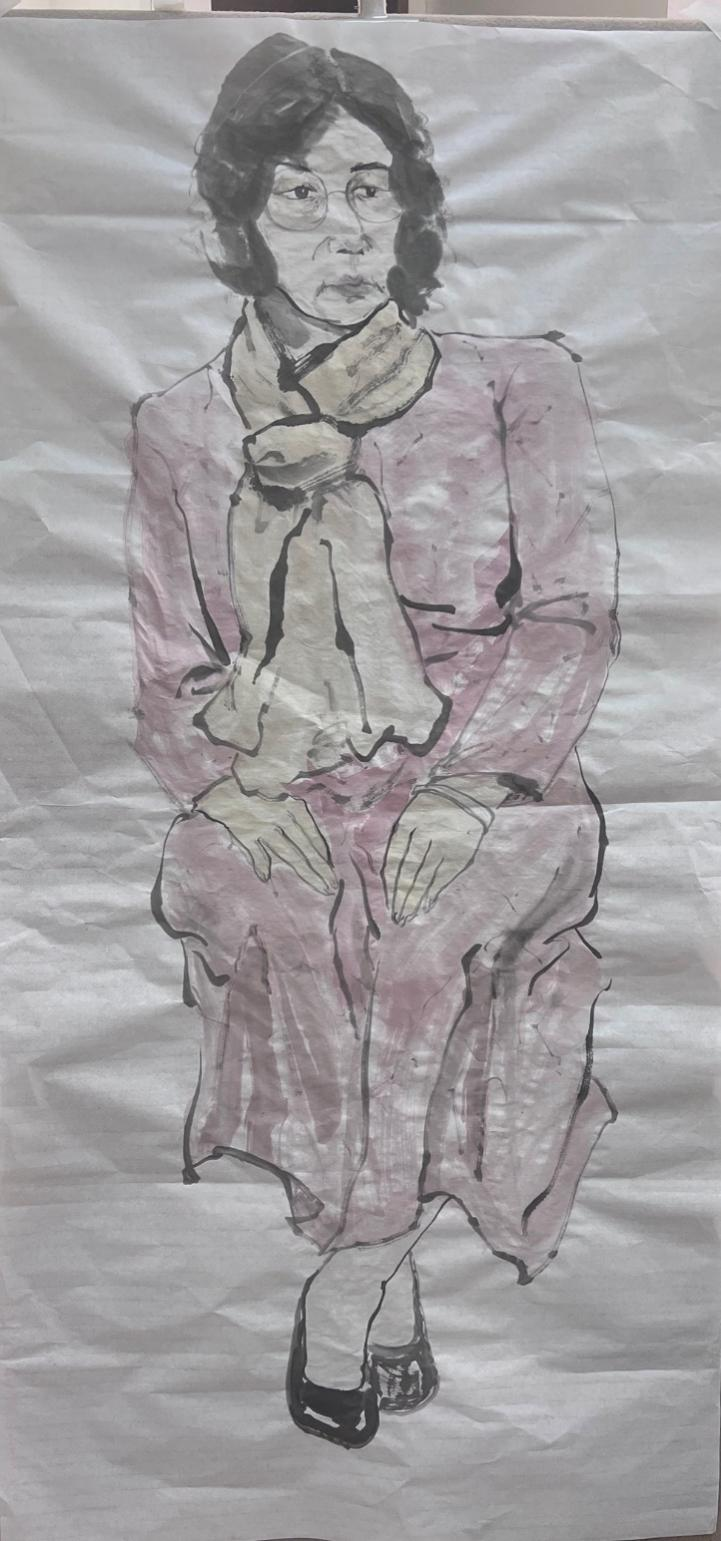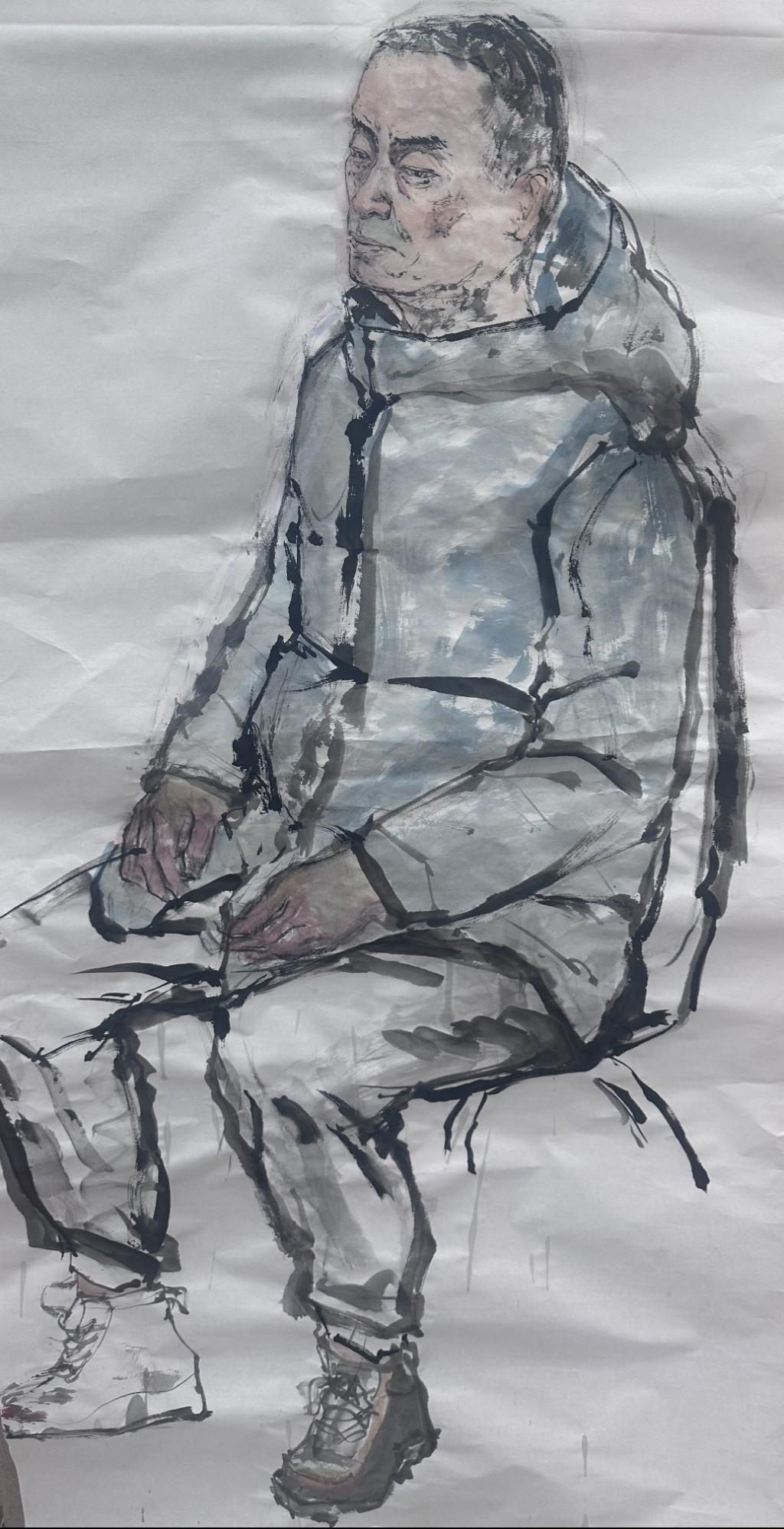 上了毛笔人物写生这门课,让我们受益颇多。毛笔人物画写生注重笔墨的运用,通过线条的粗细、浓淡、虚实来表现人物的形态和神韵。陈岱老师的教学让我们深刻体会到这一艺术形式独特的魅力与价值,我们在实践中我们学会了如何观察人物的特征,并尝试将其转化为笔墨语言,学会如何运用笔墨色彩的浓淡、干湿来表现人物的神态和气质,学会了运用不同的笔触和墨色来表现人物的不同质感和情绪。从浓淡干湿,到快慢转折,每一次落笔都需要精心斟酌,以求与对象相呼应。这种技巧的训练,让我们在表达人物肖像时能更加自如地使用工具去驾驭画面,让作品流露出丰富的层次和变化,这对提升我们的绘画技巧有很大帮助。