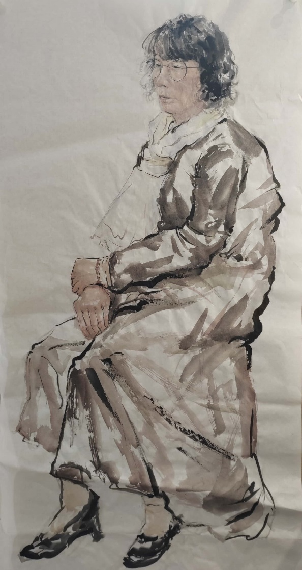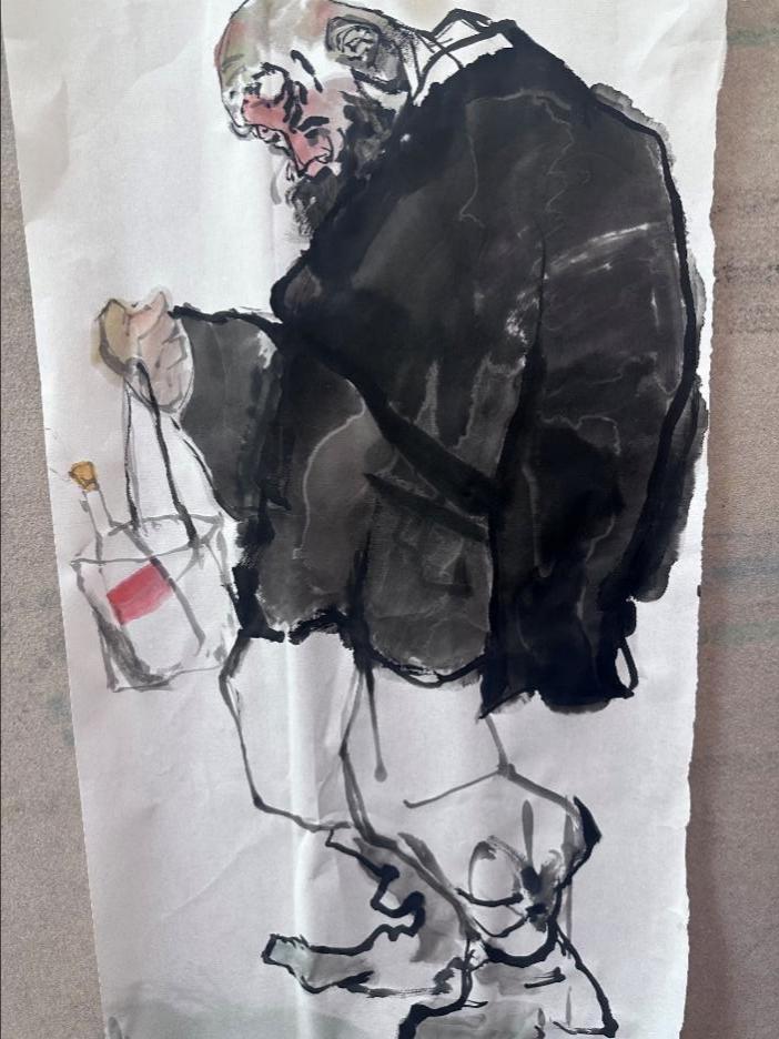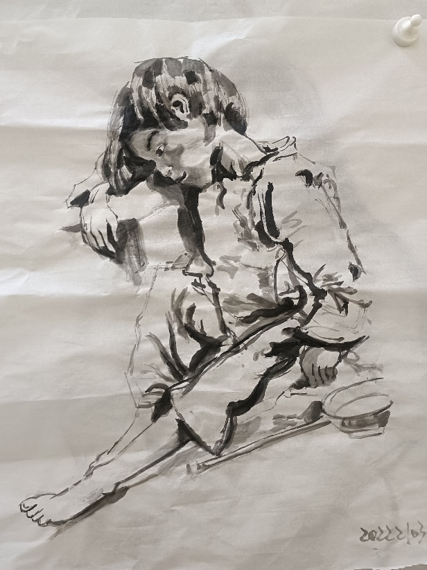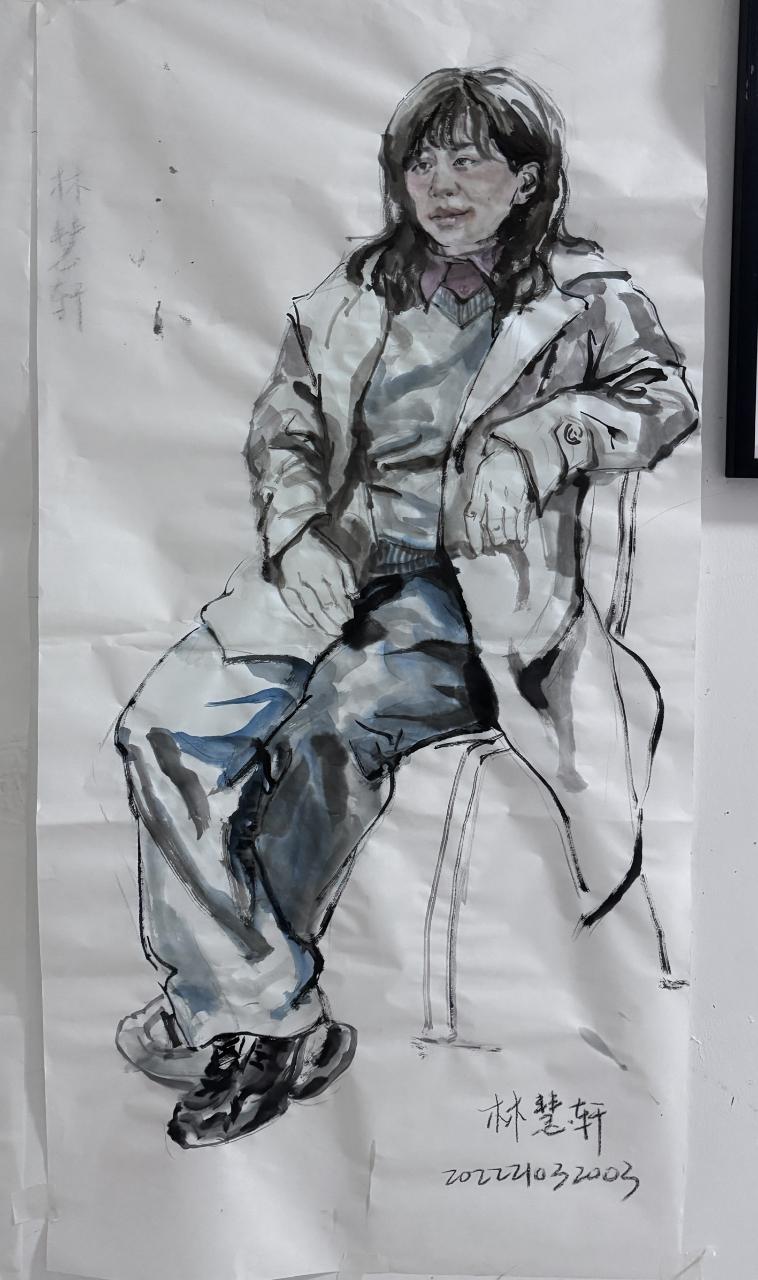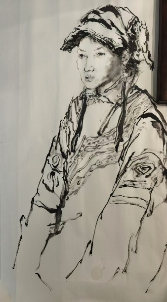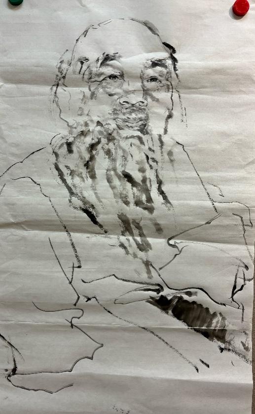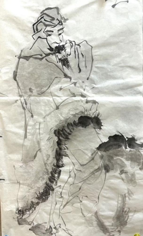 通过陈岱老师的示范,让我们了解到无论是粗犷的泼墨还是细腻的勾勒,都能表现出人物的形体神态。通过前期的反复观摩与临摹,我们渐渐领悟到空白亦是画的一部分,它与实体共同构建了作品的呼吸感与流动美。在课程学习里,我们更加深刻地理解了“写意”不仅仅是一种绘画技法,更是一种艺术表达方式,它要求画家在创作中追求意境和情感的传达,而不仅仅是形象的再现。写意人物画强调线条的流畅和笔墨的变化,我们在实践中学习了如何运用笔墨的浓淡、干湿来表现人物的神态和气质,这对提升我们的绘画技巧有很大帮助。在陈岱老师的课堂上,师生之间的交流频繁而热烈,同学们每个人都有自己的见解和创作风格,大家一起交流学习,共同进步。