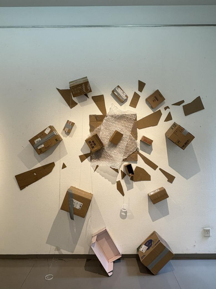 作品说明:此作品以纸箱为媒介,完整与破碎的纸箱组合,似在揭示消费真相。完整纸箱代表冲动消费的产物堆积,破碎纸板象征过度消费后的残骸。意在提醒人们审视消费行为,避免盲目,倡导理性消费,让购物回归需求本质。