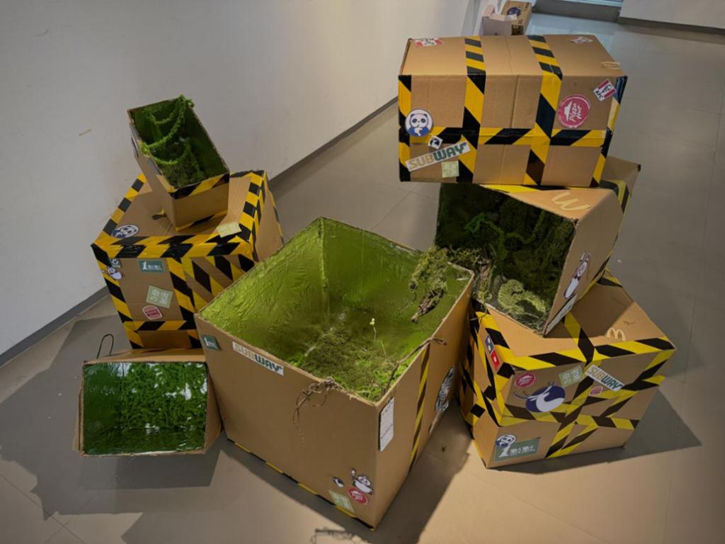作品说明:这组装置以常见快递纸箱为媒介,正面呈现青苔绿植、树木等“自然”景象,背面则填满塑料瓶与快餐包装残渣。观众在围绕与窥探的过程中,意识到环保视觉的表象下,隐藏的是消费主义堆积的垃圾现实。自然,被打包、贴标、消费,也正在失去真实的入口。
