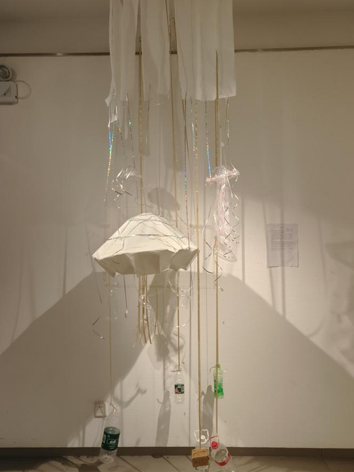 这幅作品以海洋污染为主题,整个装置由废纸、塑料瓶和细长的飘带组成,营造出一种华丽和令人警醒的效果。 水母形象:画面中最显眼的是几只巨大的水母雕塑,它们悬挂在空中,仿佛在水中游动。这些水母是由鱼线吊起来的,给人一种轻盈漂浮的感觉。然而,仔细观察会发现,这些看似美丽的水母实际上是用废弃塑料制成的,象征着海洋生物因摄入大量塑料垃圾而受到威胁的生命状态。