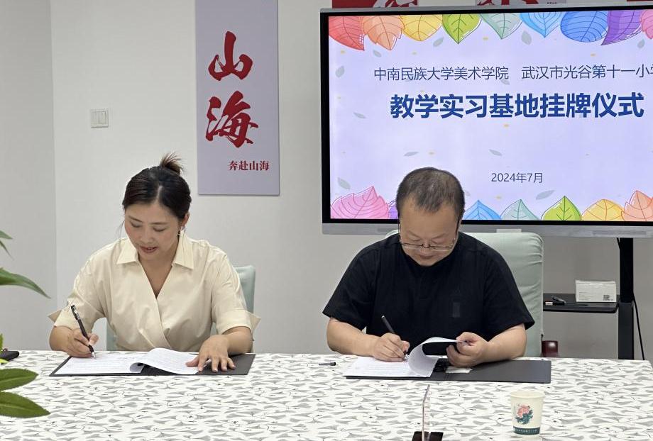 李校长表示光谷第十一小学一直致力于打造富有特色的学校美育体系,为学生提供多元化、个性化的学习体验。此次与美术学院的携手共建,将为学校艺术教育注入新的活力,推动学校特色美育教学质量的全面提升。也希望民大美院能为十一小的传统文化特色校本课程开发建设,给予更多的专业与技术支持。聂扬眉书记对此表达认同,并明确表示,美术学院将持续选拔最优秀的导师及学生,对十一小的校本课程、校园建设、社团服务等多维度给予最大化的专业支持。