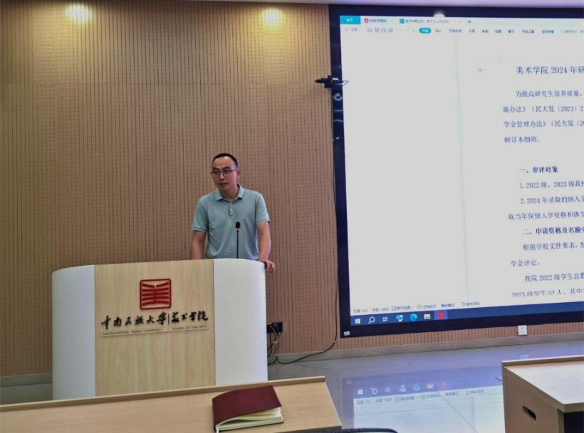 夏晋则依据《beat365英国正版唯一网址研究生奖助体系实施办法》(民大发〔2021〕21号)、《beat365英国正版唯一网址研究生学业奖学金管理办法》(民大发〔2016〕76号)文件的相关规定,结合学院、学科、专业,及前期相关评选工作遇到的问题,向同学们详细地解读了新修订的《美术学院2024年研究生学业奖学金实施细则》相关内容,并明确了相关奖学金评选的政策依据、评价标准,以及修订增补的原则与初衷。他强调此次新修订的相关细则,立足公平性、公正性与均衡性,虽不可言及绝对完美与完善,但竭力兼顾学院不同学科专业、研究领域的特点,冀希以新修订的细则统一学业评价标准,建构成果考量的杠杆,明确学习的目标与价值取向,研习可锻造之才干。并希望在以年级班委为主体的评选工作小组基础上,全员监督、全员参与此次评选工作中。