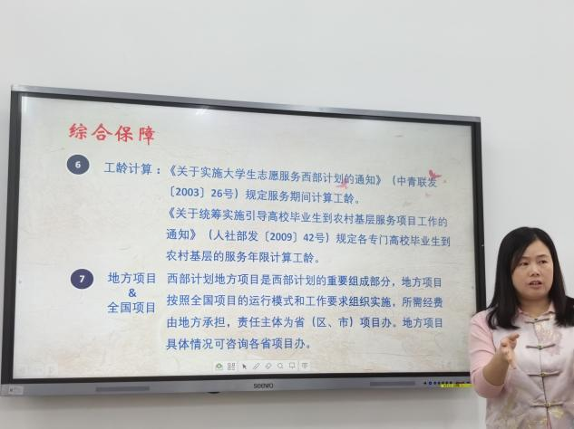 宣讲会上,李然老师对大学生西部志愿者服务计划进行了全面讲解,包括招募对象、服务时长、工作内容等关键信息,让同学们对这个计划有了更清晰的认识。同时,李老师还对各地区招募要求进行了深刻的政策分析,让同学们了解到不同地区招募要求的差异和特点,为同学们的报名提供了有力的参考。