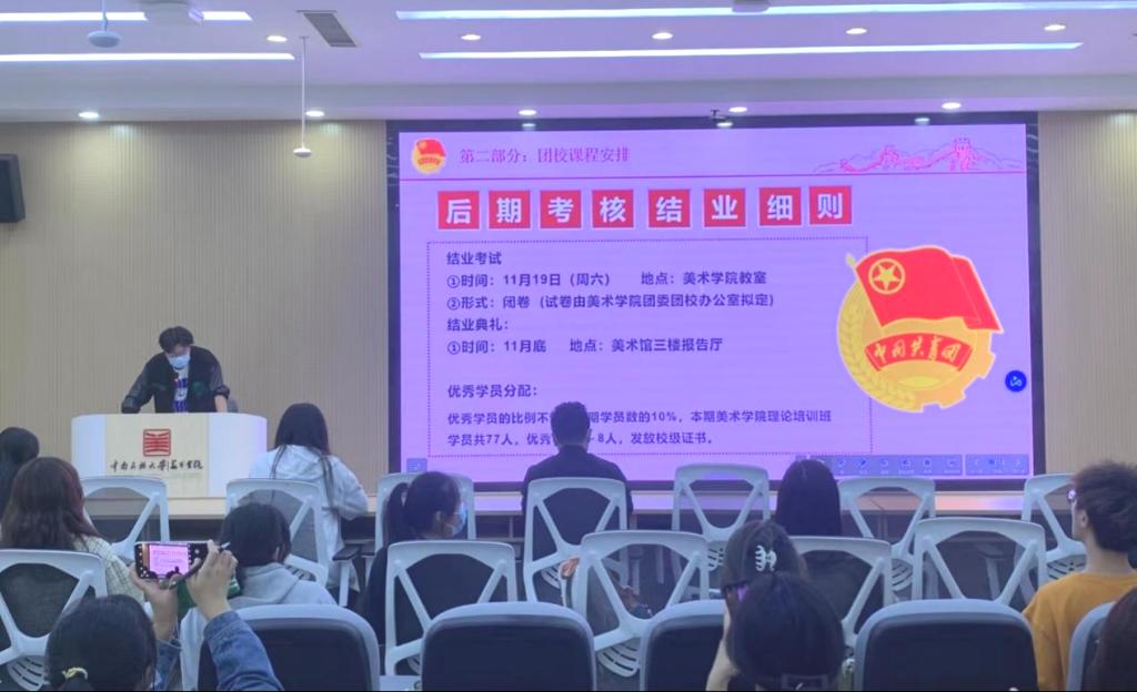 2022年11月4日中午12点10分,美术学院2022——2023年度基层团校培训班在美术馆三楼报告厅举行开班仪式。培训班77名学生成员,院团委副书记王海涛老师、陈旻霄学姐、贾萱学姐出席会议参加开班仪式,活动由刘禹隆同学主持。