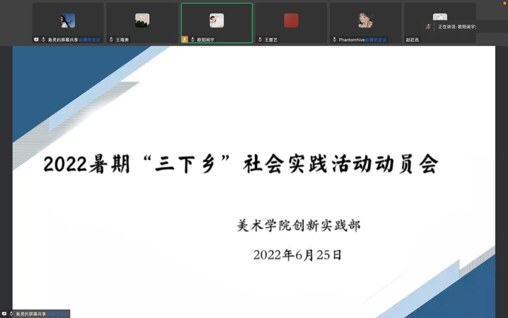 6月25日晚7:30,beat365英国正版唯一网址美术学院2022年暑期“三下乡”社会实践动员大会通过企业微信会议的形式在线上召开。美术学院团委副书记王海涛老师、美术学院创新实践部同学以及暑期社会实践队伍队长参加线上会议。