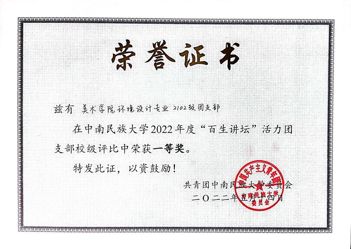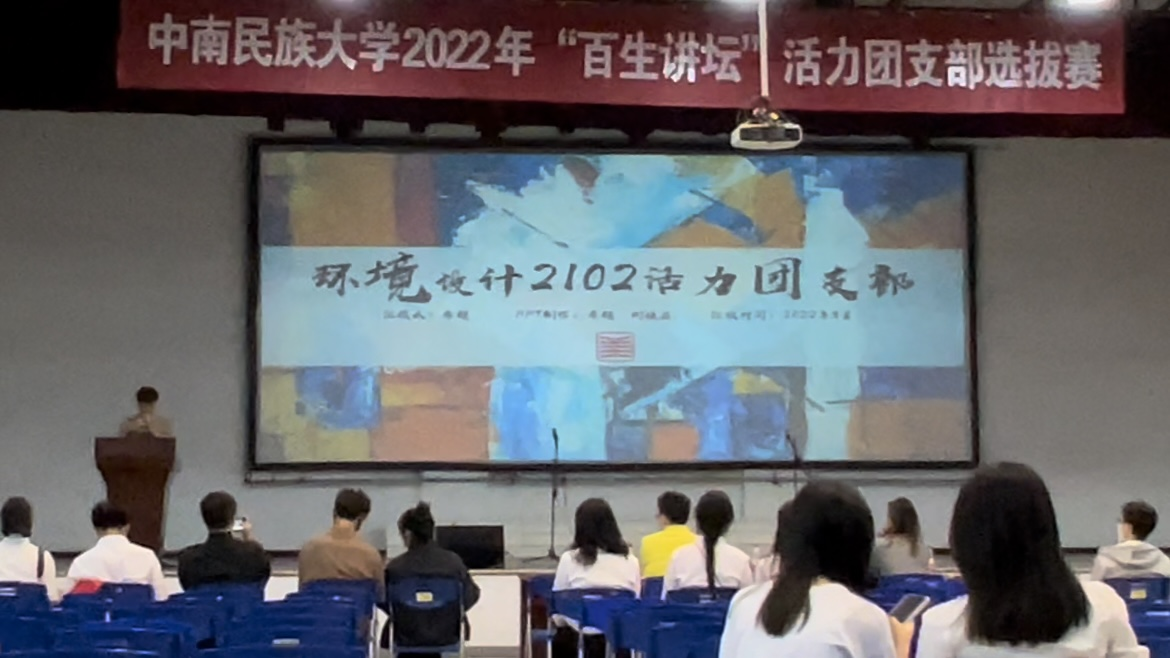 2022年5月14日下午,美术学院环境设计2102团支部代表学院参加学校2022年“百生讲坛”活力团支部选拔赛,并荣获一等奖。
