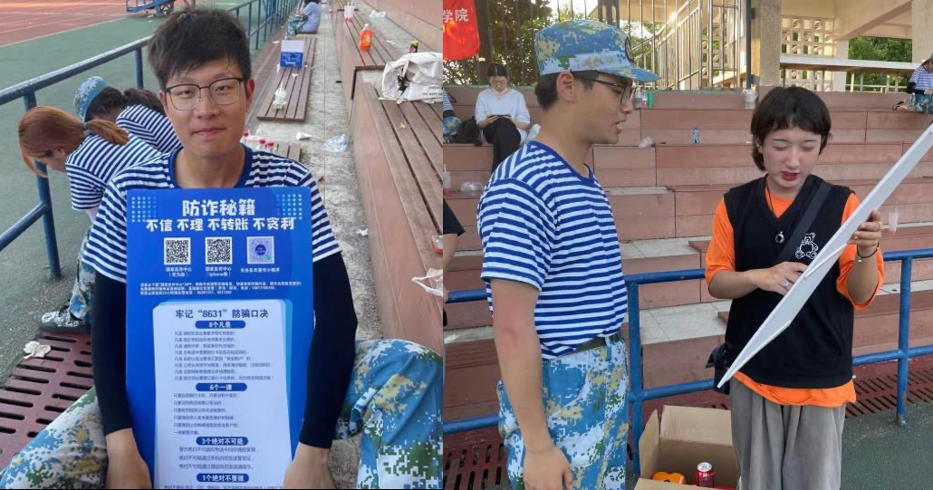 5月10日下午15:00,美术学院反电诈学生宣讲团到南湖体育中心慰问2020级军训学生,在军训场地现场组织反电诈安全教育。
