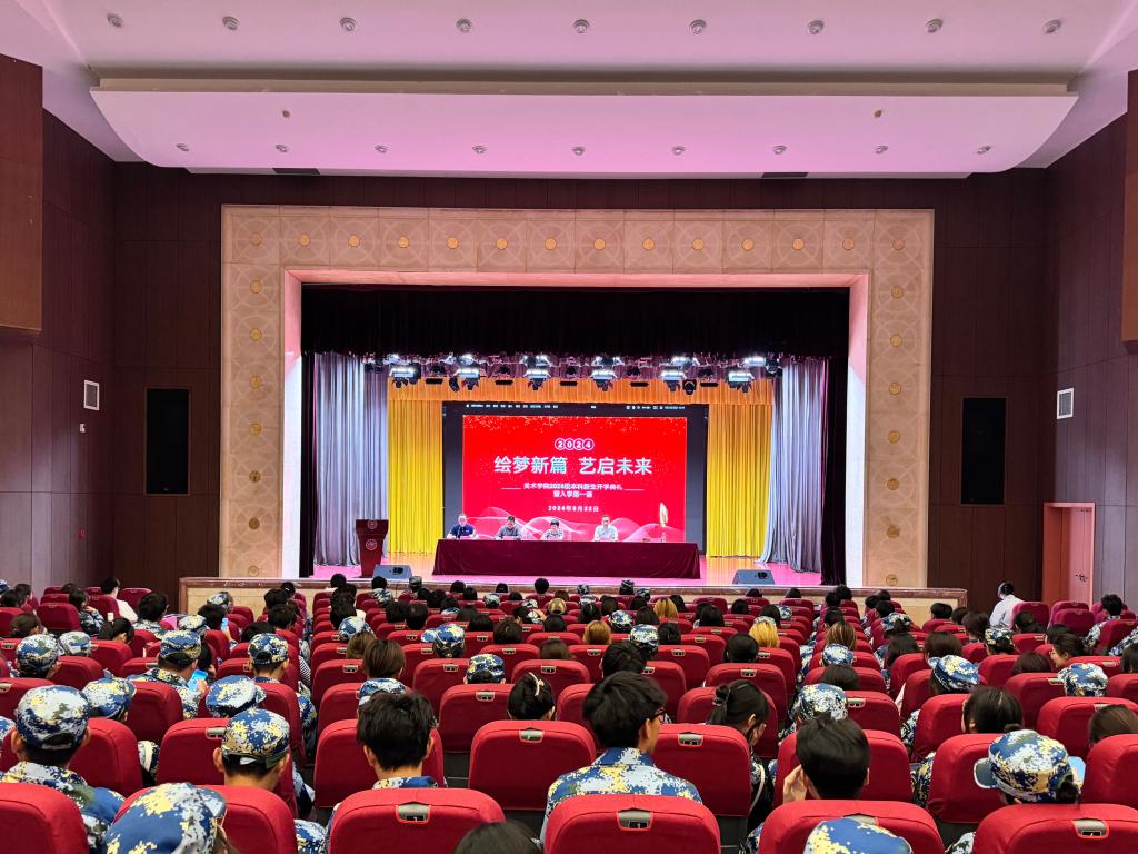 2024年9月22日上午10点,美术学院2024级本科新生开学典礼暨开学第一课在学术会堂举行。美术学院党委书记邹反修,副院长程超、潘俊,2024级新生班导师代表游嘉、辅导员向明锐,学生代表李超,以及2024级各班班助和全体学生参加会议。会议由学院党委副书记聂扬眉主持。