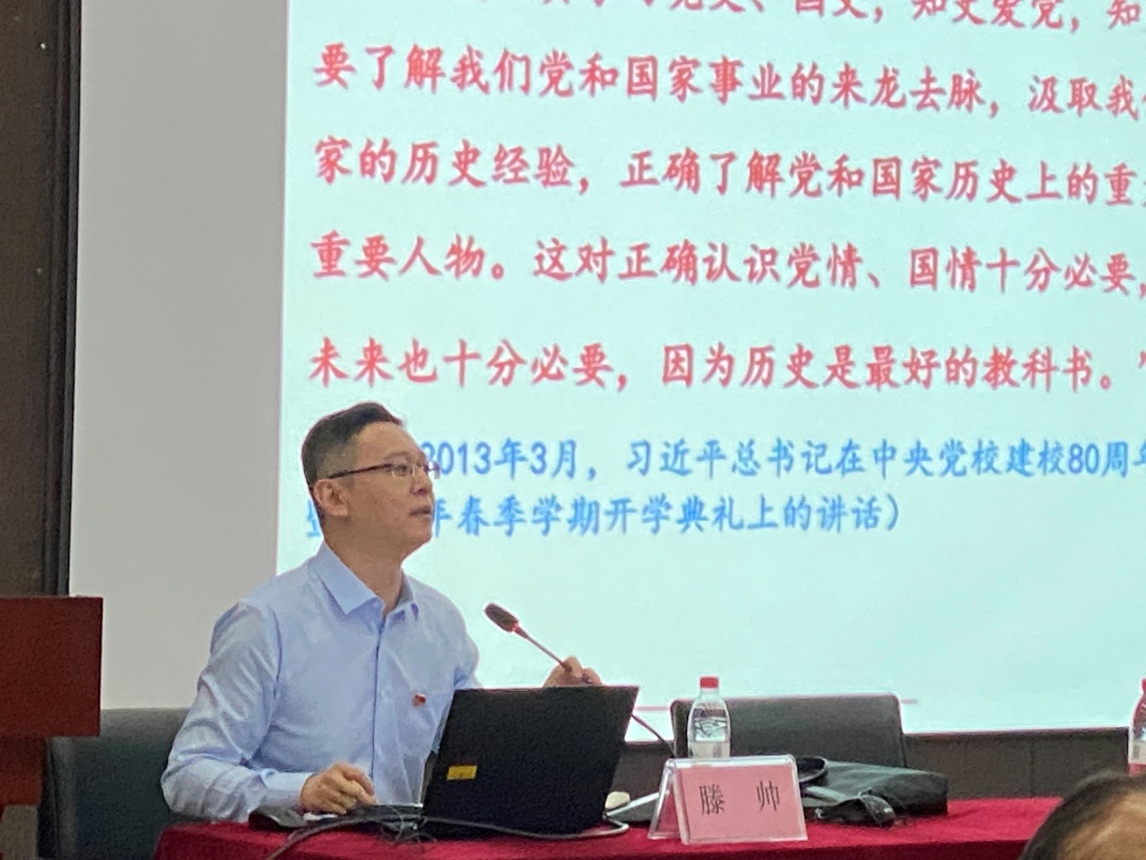 滕帅副教授首先介绍了学习党史的重大意义,他强调,“百年党史熔铸了中华民族新的血脉,百年党史为解决现实问题提供借鉴“,滕帅老师引经据典,系统阐释百年党史塑造的共产党人的精神谱系,指出党史值得每一位共产党人认真学习。他带领全体老师重温了一遍中国共产党自诞生以来,在马克思主义学说指导思想的指引下,带领全国人民寻求救国救民道路,开展艰苦卓绝的大革命、土地革命、抗日战争,在社会主义建设时期,又带领全国人民探索社会主义道路,执行改革开放基本国策,带领全国人民走向社会主义新时代的辉煌历史,指出没有中国共产党的领导,就没有中华民族的独立和复兴。讲座最后,滕帅副教授总结了党的发展历程带来的经验与启示,强调我们要高举马克思主义旗帜不动摇,坚持全心全意为人民服务的宗旨,全体党员要忠于党的核心领导地位,党要坚持真理,修正错误,在自我革命中保持先进性,要执着坚守社会主义理想和信念。