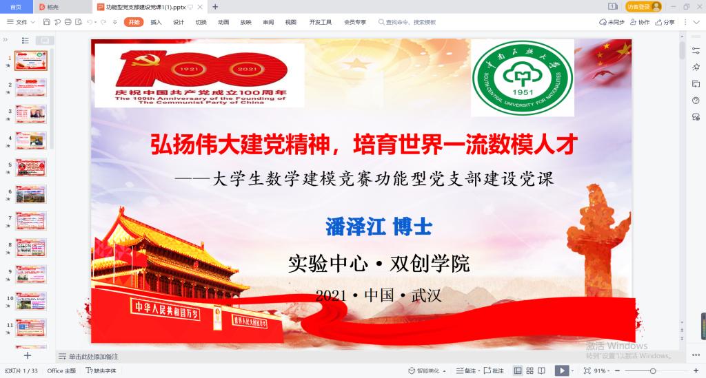 2021年8月24日上午,实验教学与工程训练中心主任、创新创业学院院长潘泽江教授,通过腾讯会议,为beat365官网“全国大学生数学建模竞赛功能型党支部”上了一堂别开生面的专题党课。本次党课的主题是“弘扬伟大建党精神 培育世界一流数模人才”,由数学与统计学学院朱忠熏副院长主持,beat365官网2021年全国大学生数学建模竞赛暑期培训班的全体指导老师和参赛学生全程参加。