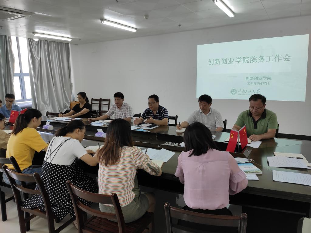 2021年9月27日下午,创新创业学院在740会议室召开院务工作会,创新创业学院领导、科室负责人及全院教职工参会,会议由潘泽江院长主持。