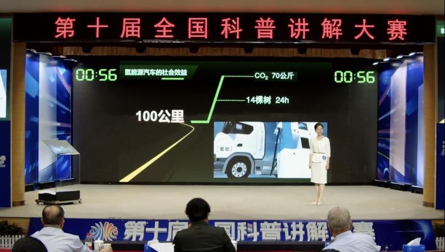 比赛中,教育学院陈亚凌老师立足新能源,从国家绿色发展大战略出发,介绍氢能源汽车的发展历史和运作原理,生动讲解了氢燃料电池的化学反应,并详细解释了氢能源汽车的热点问题,突出氢能源汽车未来发展前景。其讲解自然流畅,科学知识突出,收获了现场观众的阵阵掌声,得到了评委们的一致肯定。