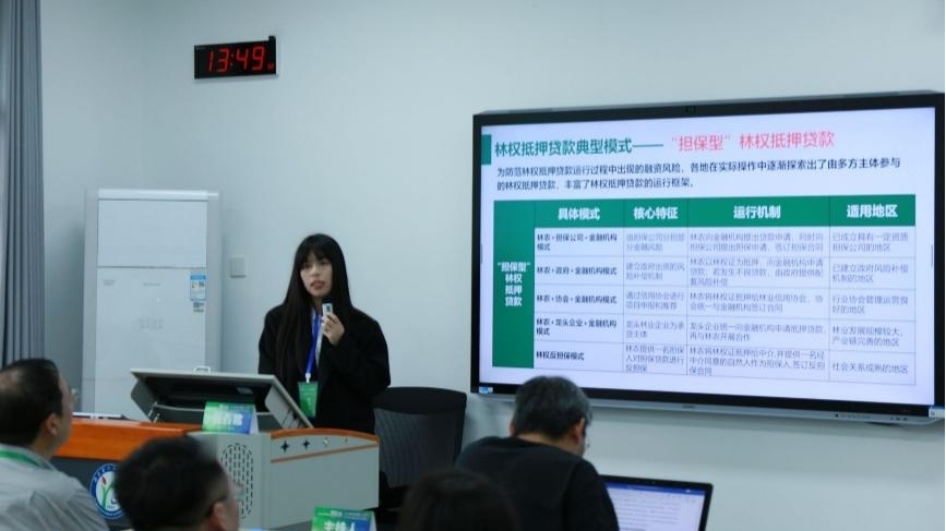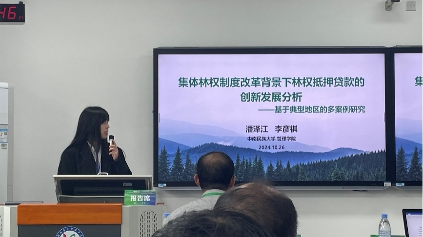 潘泽江教授指导的研究生3篇学术论文——李彦祺的论文《集体林权制度改革背景下林权抵押贷款的创新发展分析》、余长轩的论文《长江经济带省份绿色发展效率及其影响因素研究》、黄浩的论文《集体林权制度改革背景下林下经济发展路径研究》入选论坛。李彦祺的论文围绕“林权抵押贷款创新发展”主题,结合生态产品价值实现、融资风险管理、市场化林权收储担保与抵押品核算评估等问题进行了现场汇报。