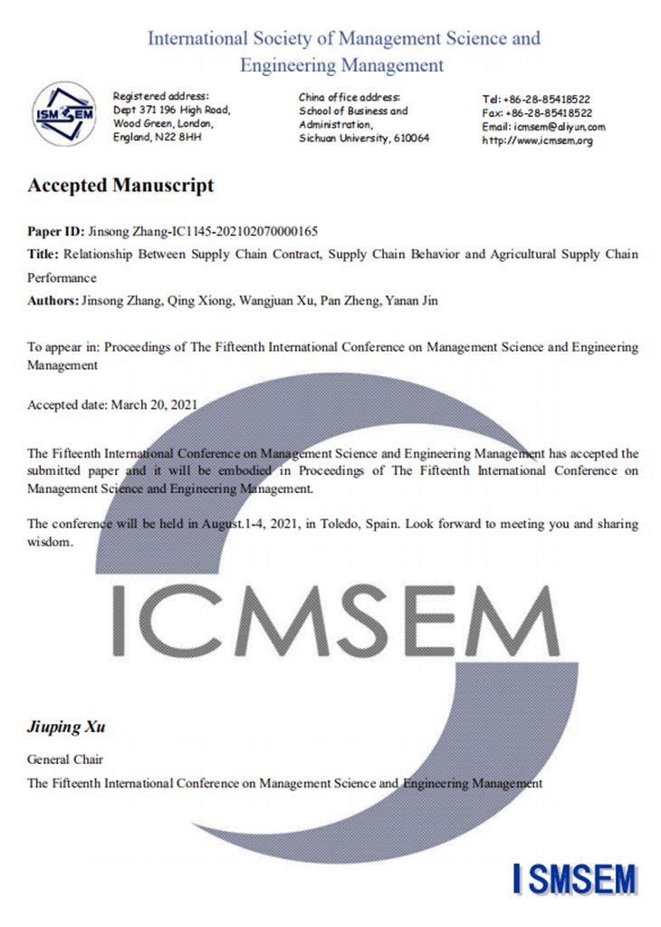 我院张劲松教授的《Relationship between Supply Chain Contract, Supply Chain Behavior and Agricultural Supply Chain Performance》在2021年3月20日被第十五届管理科学与工程管理国际学术会议(Proceedings of The Fifteenth International Conference on Management Science and Engineering Management)录稿,拟被EI数据库收录。