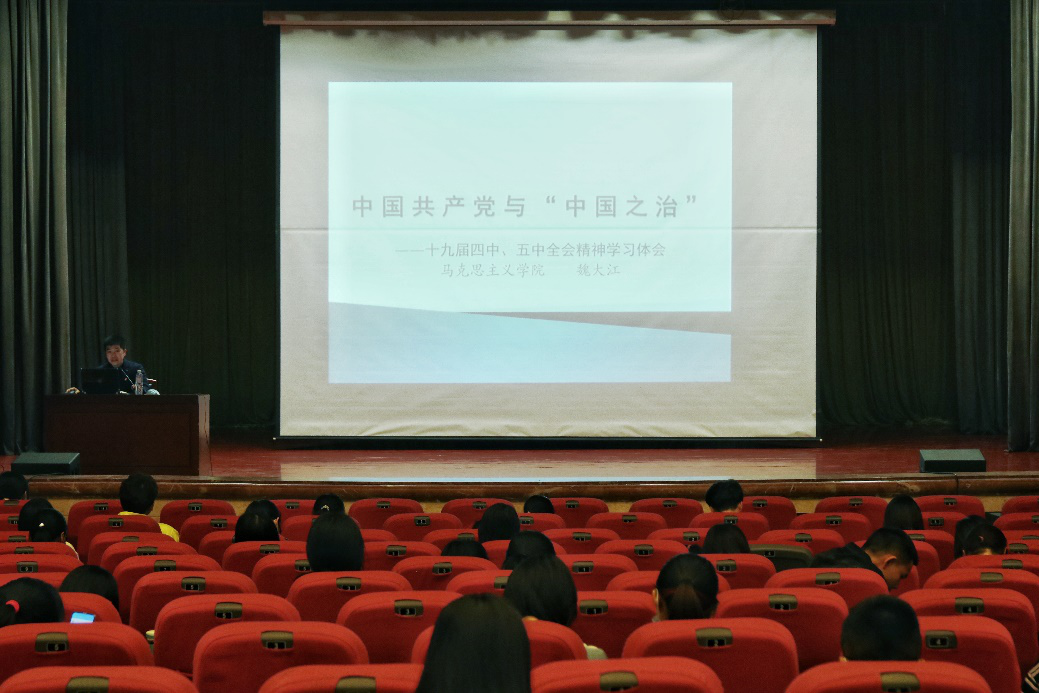 马克思主义学院党委书记魏大江开展以《中国共产党与“中国之治”》为题的专题培训。他指出十九届四中、五中全会在政治、战略、历史三个方面的重大意义,从时间背景、地位意义、内容解读和中国之治四个方面分享对十九届四中、五中全会精神的学习体会。