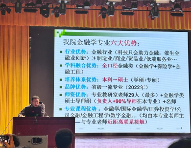 金融学教研室陈全功老师从学院金融学专业悠久发展历史出发,针对同学们关心的保研、就业两方面详细介绍了金融学专业近几年来取得的丰硕成果,并从行业、学科融合、培养体系、品牌、师资、专业课程分享了本专业的六大优势。