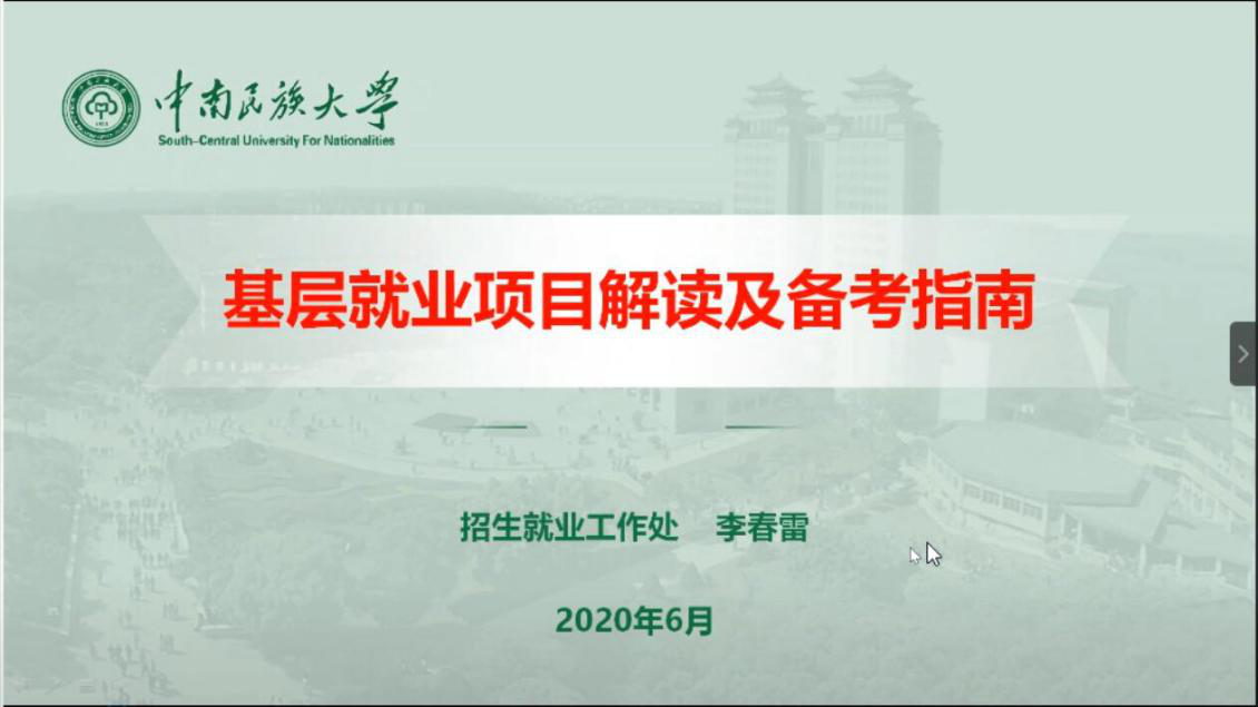 李春雷围绕“就业形势与政策”“公务员招考、事业单位招聘”“基层就业项目介绍”和“备考指南”四个方面展开辅导讲座。在就业形势和政策方面,他指出,党和政府对毕业生就业工作高度重视,针对疫情影响,各部门、各地方政府出台了一系列就业利好政策。接下来,他为大家分类宣讲了面向毕业生就业出台的相关文件,重点对公务员招考、事业单位招聘及基层就业项目作出介绍。他鼓励毕业生们充分利用好各类就业平台和就业信息发布渠道,把握机遇,详细了解、积极参与“选调生”“大学生村官”“师资‘特岗计划’”“三支一扶”“西部计划”“大学生应征入伍”“科研助理”“城乡社区岗位”“创业带动就业”等基层就业项目,切实增强就业创业能力,特别是要早定位、早抉择、早准备、早受益,不负芳华,逐梦未来。