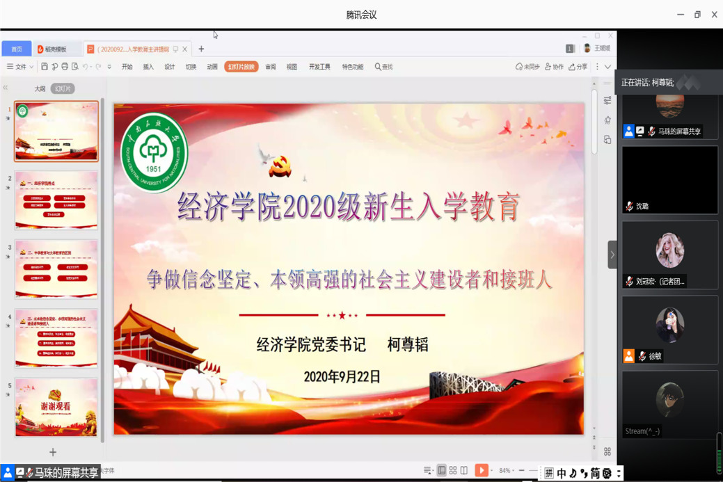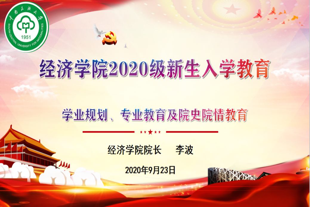 本站讯(记者:刘冠宏 童奕博 王娜)为加强2020级本科生和研究生新生入学教育,帮助新生尽快适应大学生活,经济学院党委制定了本科生和研究生新生入学教育实施方案,各项工作正在按照方案有序推进。9月22日至23日,经济学院先后开展以“理想信念教育”“院史院情及学业教育”“新生安全教育”为主题的新生入学教育系列讲座。经济学院党委书记柯尊韬、院长李波及学校保卫处副处长周武庆分别担任主讲,学院党委副书记刘君强、副院长孟庆雷及新生辅导员徐莹、覃靖然参加会议,经济学院700余名本科生和研究生新生参加学习。