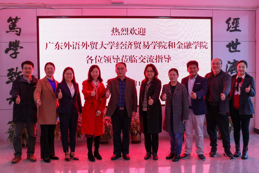 广东外语外贸大学唐静副院长一行分享了经济贸易学院和金融学院在历年招生标准、专业教学计划、优秀学生选拔和学生社会实践中的宝贵经验。广东外语外贸大学参考国内外商学院教学方式,以培养“国际化、高素质、代表性”人才为教育轴心,采用小班教学、双语授课的教学模式,建设了具有良好设施的实习基地。此外,“广交会”在实现精英人才对口化、学生实习经验化、沟通签约深入化中发挥了重要平台作用。双方就学院发展过程中面临的共同问题展开深入探讨,现场气氛热烈。