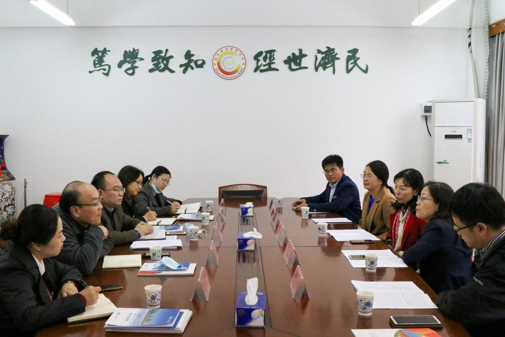 本站讯(记者:姜权卿 黄轩轩)为进一步加强学科建设、增进两校友谊,10月16日下午,广东外语外贸大学经济贸易学院和金融学院唐静、何元贵、张林、许月丽、龙世邦一行五人莅临经济学院开展工作交流。经济学院院长李波、副院长毛中明、教师段世德、张娟、教学秘书谈玉婷到场参加。会议由李波主持。