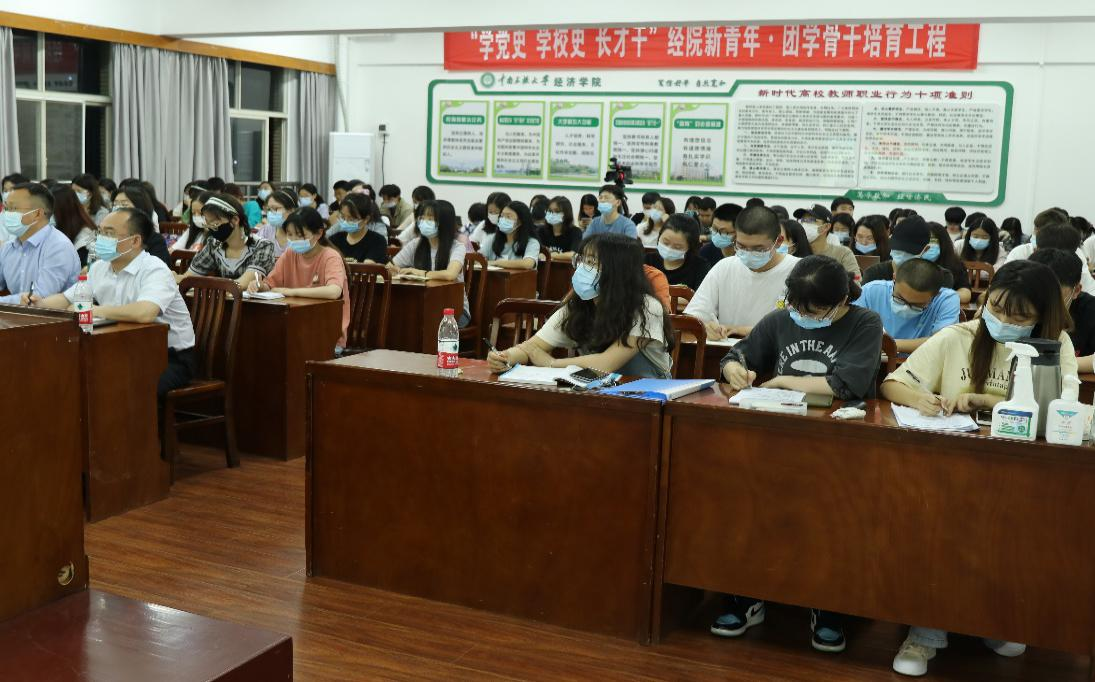 本站讯(记者:刘筱雨)5月7日晚,校长李金林参加经济学院经济学大类2009班“学党史 学校史 长才干”主题团会,为学生讲校史,勉励学生知校、爱校、荣校。经济学院2009班全体学生、学院党委副书记、院长李波、党委副书记刘君强、2019和2020级辅导员及学院团学骨干培育工程学员到场学习。