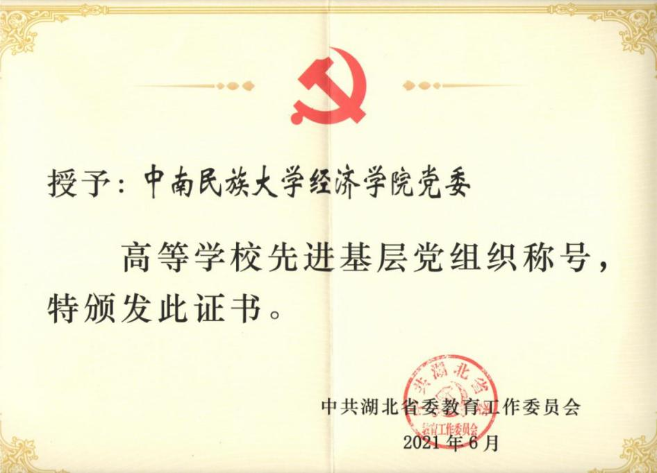 在中国共产党成立100周年之际,中共湖北省委和中共湖北省委教育工委在“两优一先”评选中表彰了一批高等学校先进基层党组织、高等学校优秀党务工作者和优秀共产党员。经济学院党委被湖北省委教育工委授予“高等学校先进基层党组织”荣誉称号。