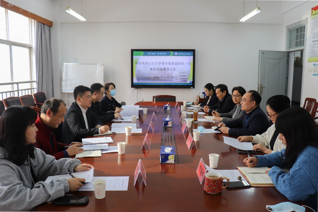 调研会上,李波代表学院对江汉大学商学院调研组的到来表示热烈欢迎,介绍了学院学科专业建设、人才培养、创新创业工作及师资队伍建设等相关方面情况。陈祖海、张英、毛中明、张娟结合各自负责的工作内容,分别介绍了学院的博士点建设、各专业硕士与本科发展情况及实验班工作。双方就科研管理、科研团队建设、研究生培养、金融专硕建设等问题进行了深入的探讨与交流。调研会后,陈磊院长一行参观了教授办公室、硕士研习室、教研室、省部级科研平台等。