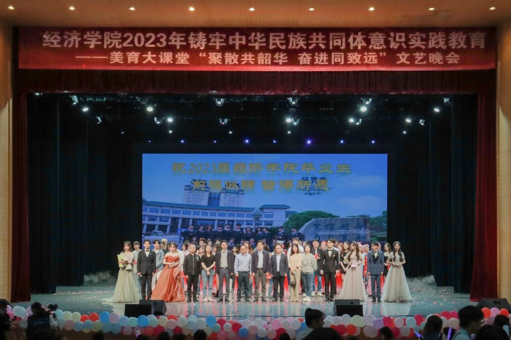 为切实加强学院美育教育工作,推动铸牢中华民族共同体意识教育有形有感有效,培养德智体美劳全面发展的社会主义建设者和接班人,4月14日晚,经济学院在大礼堂举办了2023年铸牢中华民族共同体意识实践教育——美育大课堂“聚散共韶华 奋进同致远”文艺晚会。经济学院党委书记柯尊韬,党委副书记、院长李波,党委副书记刘君强,副院长熊芳、孟庆雷,教师代表,2019级、2022级全体师生和其他年级学生代表一同观看了晚会。