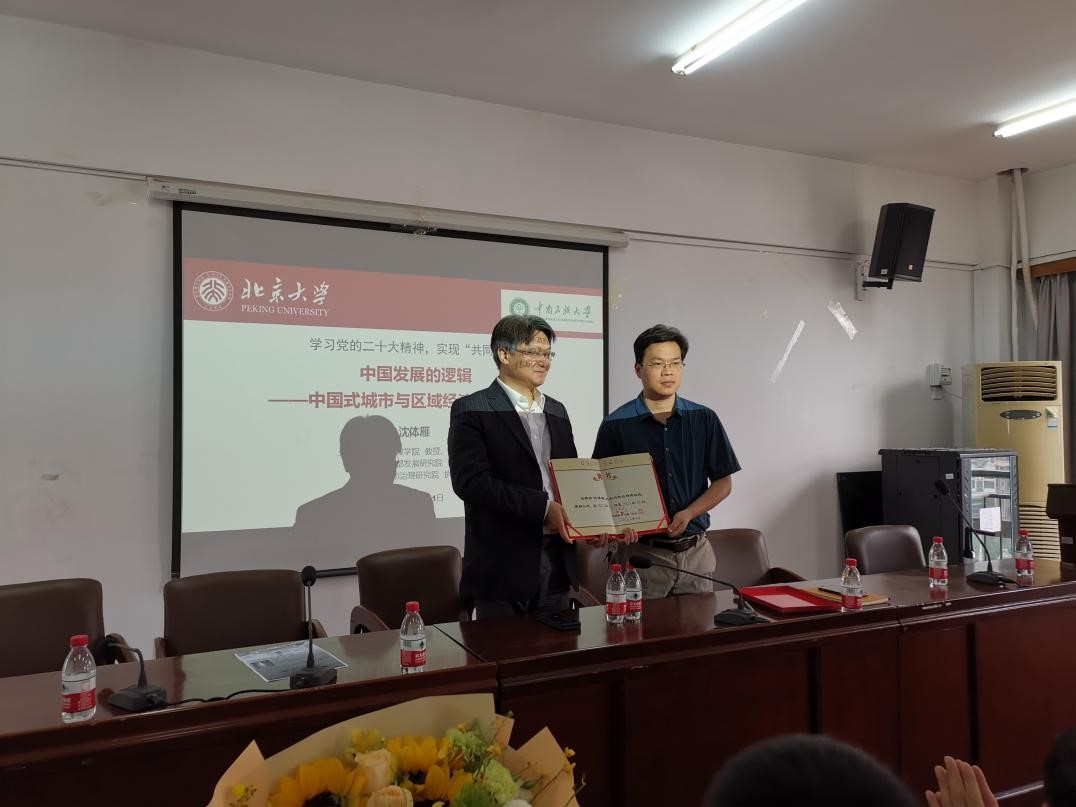 受聘仪式结束后,沈体雁教授以《中国式城市与区域经济现代化途径》为主题做专题报告。报告深入浅出,阐明中国特色的区域发展理论以及实现高质量共同发展的逻辑,并分别于“什么是好地方”、“地方如何发展”、“技术为何重要”、“如何做一个好的规划”、“如何做产业集群”、“如何做治理”等六个问题展开深入探讨。现场气氛热烈,受到老师和同学们的热烈欢迎。