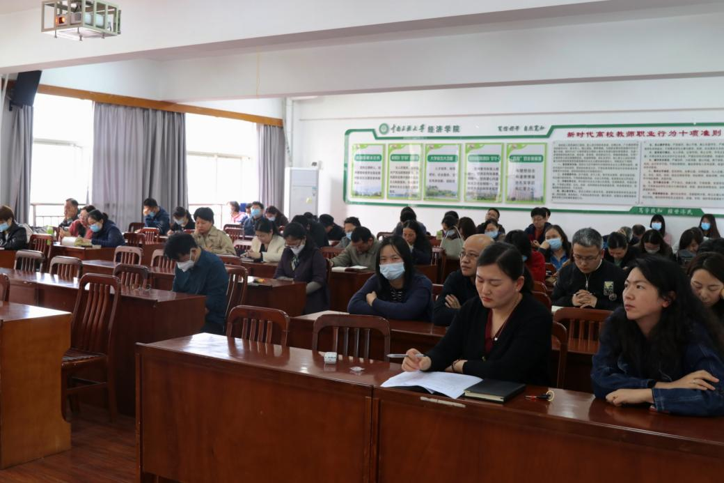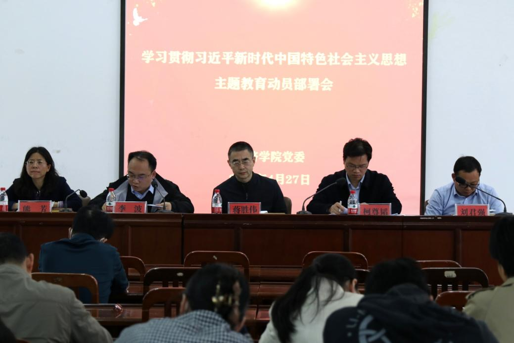 为深入学习贯彻习近平新时代中国特色社会主义思想,落实党中央、上级党组织和学校党委的统一部署,4月27日下午,经济学院召开了学习贯彻习近平新时代中国特色社会主义思想主题教育动员部署会。学校纪委办公室副主任、监察处副处长蒋胜伟参加主题教育督导,经济学院领导班子成员和全体教职工党员、部分学生党员代表参加会议。会议由经济学院党委书记柯尊韬主持。