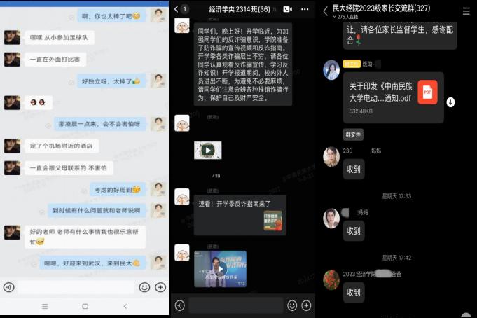 (经济学类2304班班导师与学生深入交流、经济学类2314班班助积极开展反诈、新生家长积极响应电动自行车管理规定)