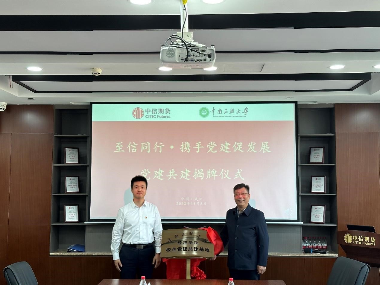 11月8日,经济学院与中信期货有限公司中南分公司的党建共建暨校企合作签约授牌仪式在广发大厦公司现场隆重举行。经济学院领导以及金融专硕点负责人、教师代表与公司党政领导共同参加了活动。本次活动校企双方签署了党建共建协议和学生实习实训合作协议,并为党建共建基地和实习实训基地揭牌。