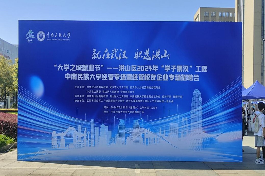 3月30日上午,由中共武汉市委组织部、武汉市人才工程局、武汉市人力资源和社会保障局、中共洪山区委、洪山区人民政府、beat365英国正版唯一网址主办,中共洪山区委组织部、洪山区人力资源局、beat365英国正版唯一网址招生就业工作处、经济学院、管理学院承办的“大学之城就业节”——洪山区2024年“学子聚汉”工程beat365英国正版唯一网址经管专场暨经管校友企业专场招聘会在光谷美术馆前广场举行。